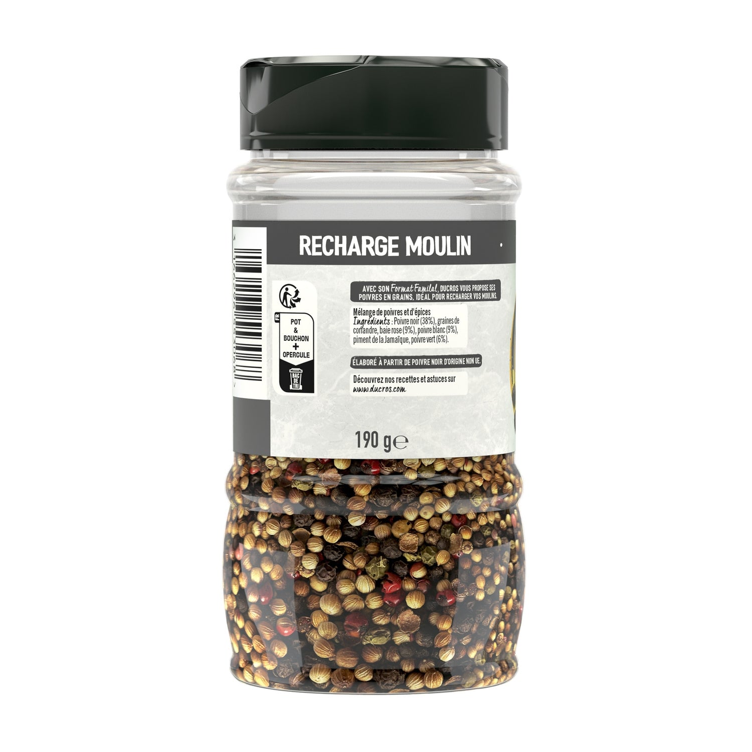 DUCROS BIETET IHNEN MIT SEINER FAMILIENGRÖSSE SEINE PFEFFERKÖRNER AN, DIE IDEAL ZUM NACHFÜLLEN IHRER MÜHLEN SIND.
