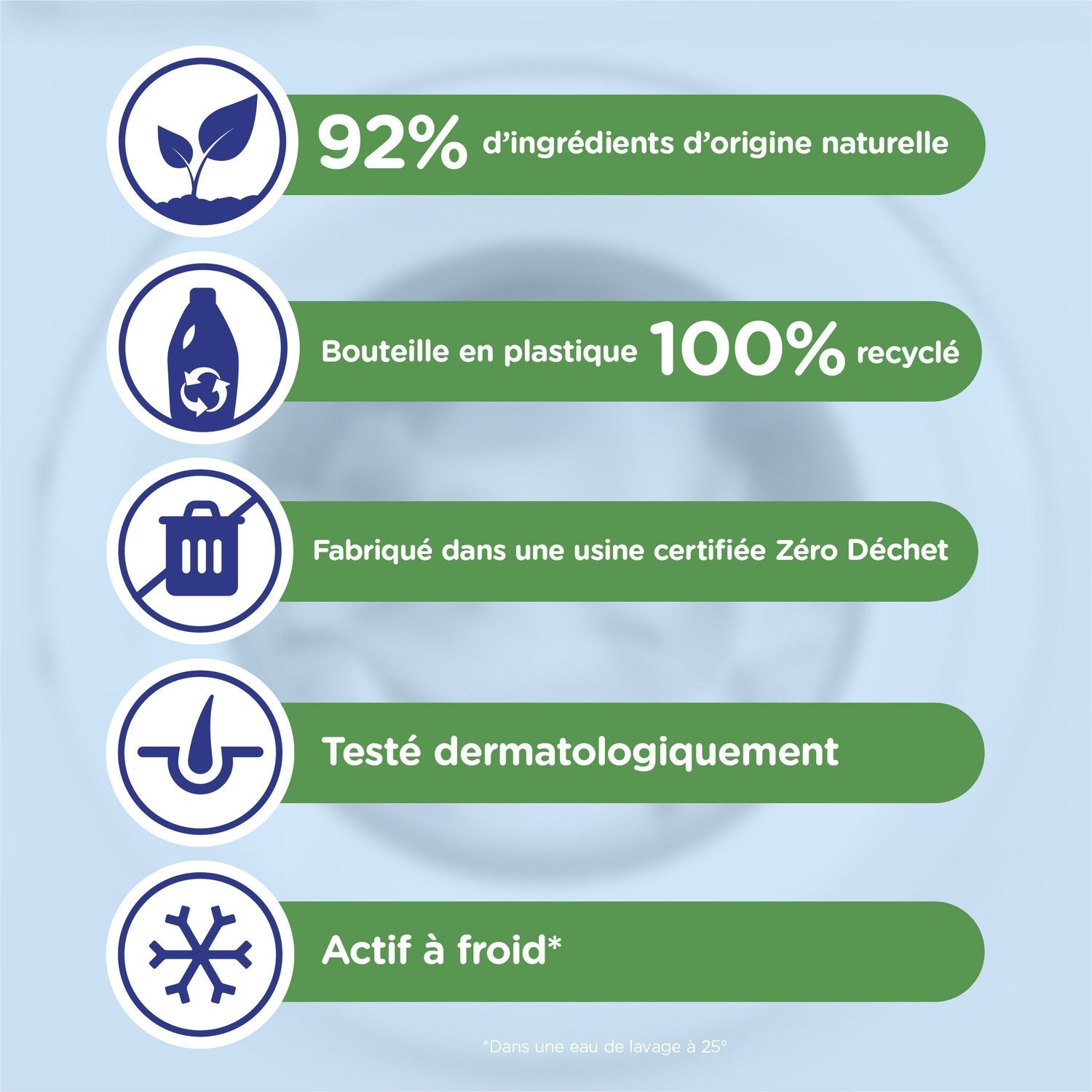 Ein praktisches, wirtschaftliches und ökologischeres Format. Die Formel ist auch in kaltem Wasser wirksam*. In Waschwasser bei 25°C. -50 % Plastik ** im Vergleich zur 1-Liter-Flasche. Hergestellt in Frankreich. 92 % Inhaltsstoffe natürlichen Ursprungs. Hergestellt in einer Zero-Waste-zertifizierten Fabrik.