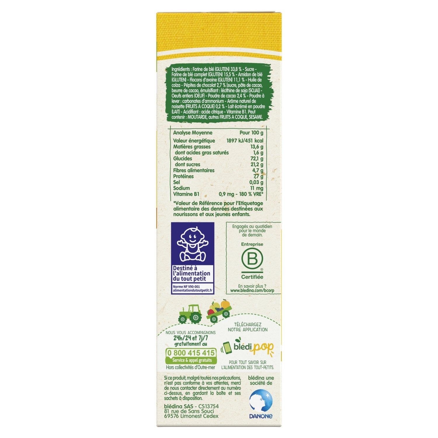 Blédina ist seit über 100 Jahren Experte für abwechslungsreiche Ernährung und unterstützt Sie bei allen Mahlzeiten Ihres Babys. Unsere Mission? Ihre Neugier auf richtiges Essen zu wecken, dank über 250 von Ernährungswissenschaftlern entwickelten und perfekt auf ihre Bedürfnisse abgestimmten Rezepten. BLEDINAS MORGEN ZUM VERSCHLINGEN ist die Produktreihe, die speziell für das Frühstück großer Babys entwickelt wurde. Diese köstlichen Rezepte wurden entwickelt, damit sie es den Großen gleichtun können, mit an ihr Alter und ihre Bedürfnisse angepassten* Keksen, um gut in den Tag zu starten. Diese Kekse haben eine knusprige Textur, die im Mund zergeht, mit kleinen Haferflocken und Vollkorn, damit das Baby neue Texturen entdecken kann. In einem praktischen, tragbaren Format: 12 Beutel mit 2 Keksen. Entdecken Sie unser Super-Gourmet-Rezept, eine Ballaststoffquelle, mit Vollkorn, Haferflocken und Schokoladenstückchen. Dieses Rezept enthält 38 % weniger Zucker**! 5 lustige Formen, um mit dem Baby über das Wetter zu sprechen. Ihr Baby kann die Matin à dévorer Kekse immer sitzend, mit aufrechtem Rücken, ohne Ablenkung und unter ständiger Aufsicht von Erwachsenen genießen. Ist BABY-ready? Sie können Ihrem Baby die Matin à dévorer Kekse geben, wenn es: – sich selbstständig fortbewegen kann – bereits zwei Backenzähne hat – mehr oder weniger weiche Stücke isst – eine Brotkruste selbstständig isst *gemäß den Säuglingsernährungsvorschriften **als die durchschnittlichen vorverpackten Schokoladenkekse. Ciqual 2020