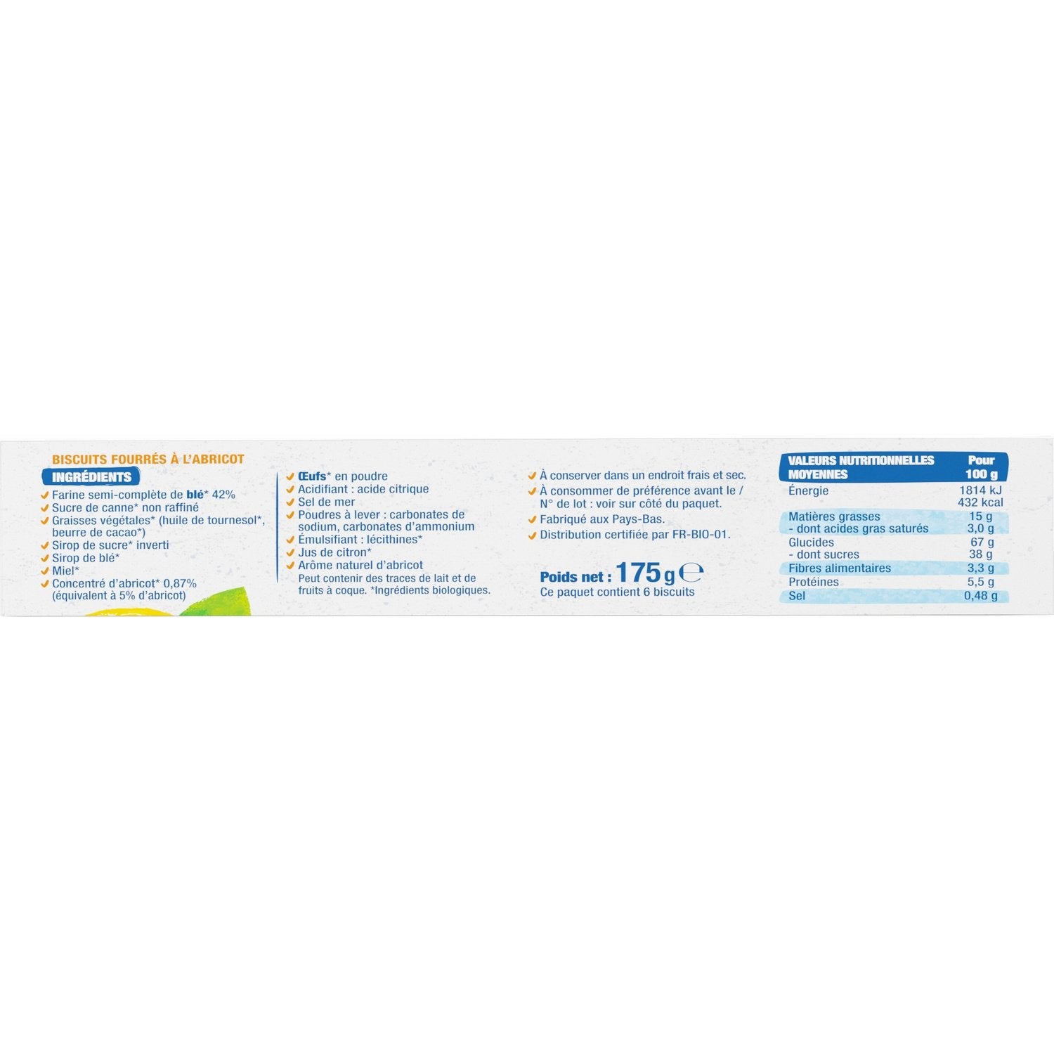 Halbvollkornmehl* 42%, unraffinierter Rohrzucker*, pflanzliche Fette* (Sonnenblumenöl*, Kakaobutter*), Invertzuckersirup*, Weizensirup*, Honig*, Aprikosenkonzentrat* 0,87% (entspricht 5% Aprikose), EIERPULVER*, Säuerungsmittel: Citronensäure; Meersalz, Backtriebmittel: Natriumcarbonate, Ammoniumcarbonate; Emulgator: Lecithine*; Zitronensaft…