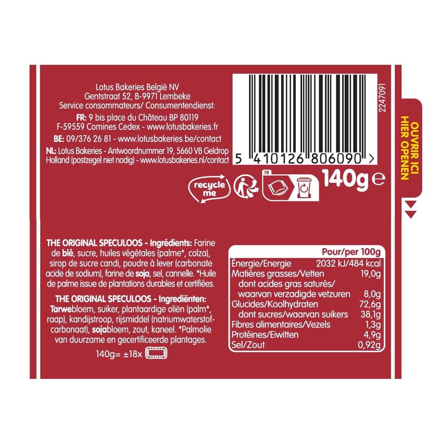 WEIZENmehl, Zucker, Pflanzenöle (Palmöl aus nachhaltigem und zertifiziertem Anbau, Rapsöl), Kandissirup, Backtriebmittel (Natriumhydrogencarbonat), SOJAmehl, Salz, Zimt