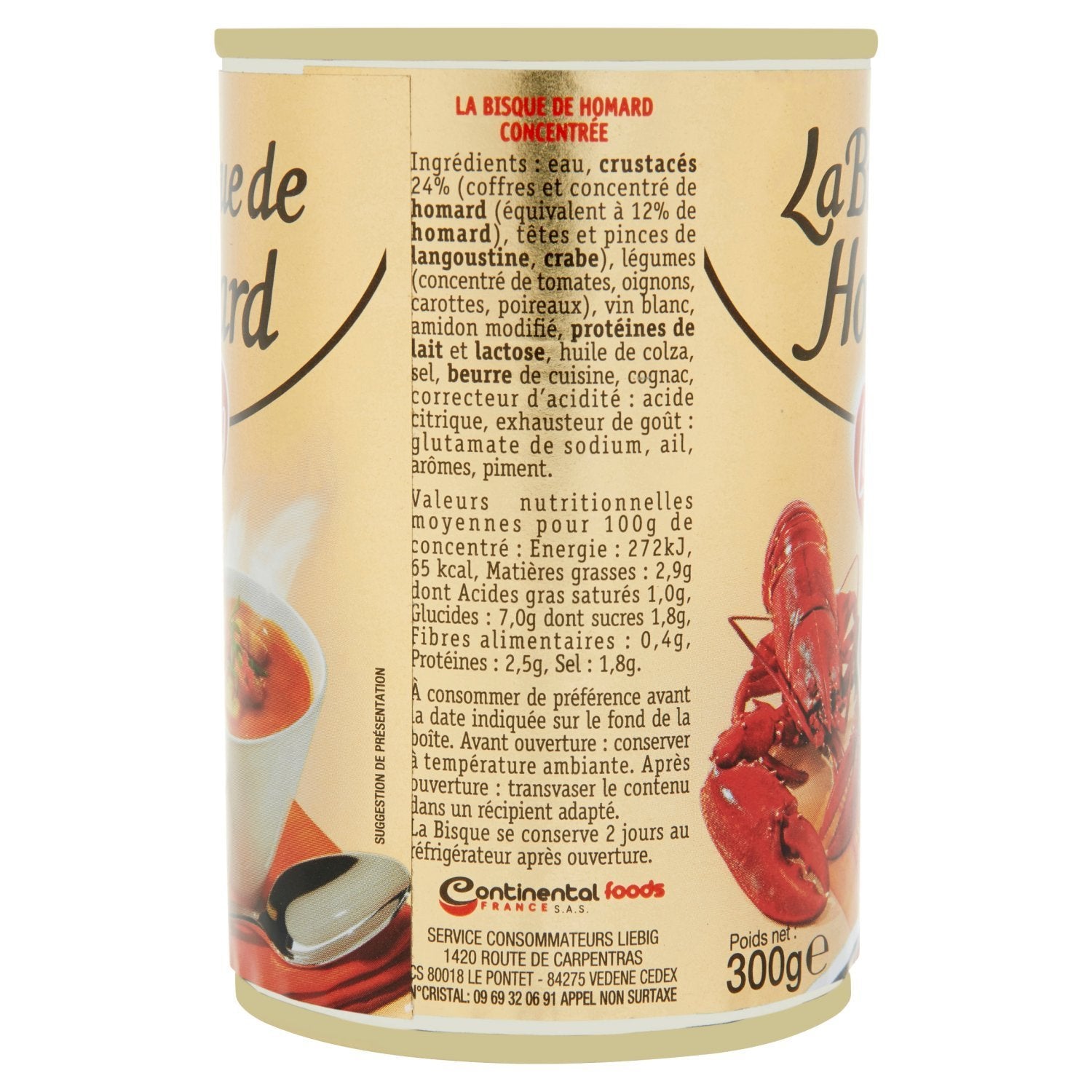 Zutaten: Wasser, KREBSTIERE 24 % (Hummerbrust und -konzentrat (entspricht 12 % Hummer), Kaisergranatköpfe und -scheren, Krabben), Gemüse (Tomatenkonzentrat, Zwiebeln, Karotten, Lauch), Weißwein, modifizierte Stärke, MILCHEIWEISS und LAKTOSE, Rapsöl, Salz, Bratbutter, Cognac, Säureregulator: Zitronensäure, Geschmacksverstärker: Natriumglutamat, Knoblauch, Aromen, Chili.