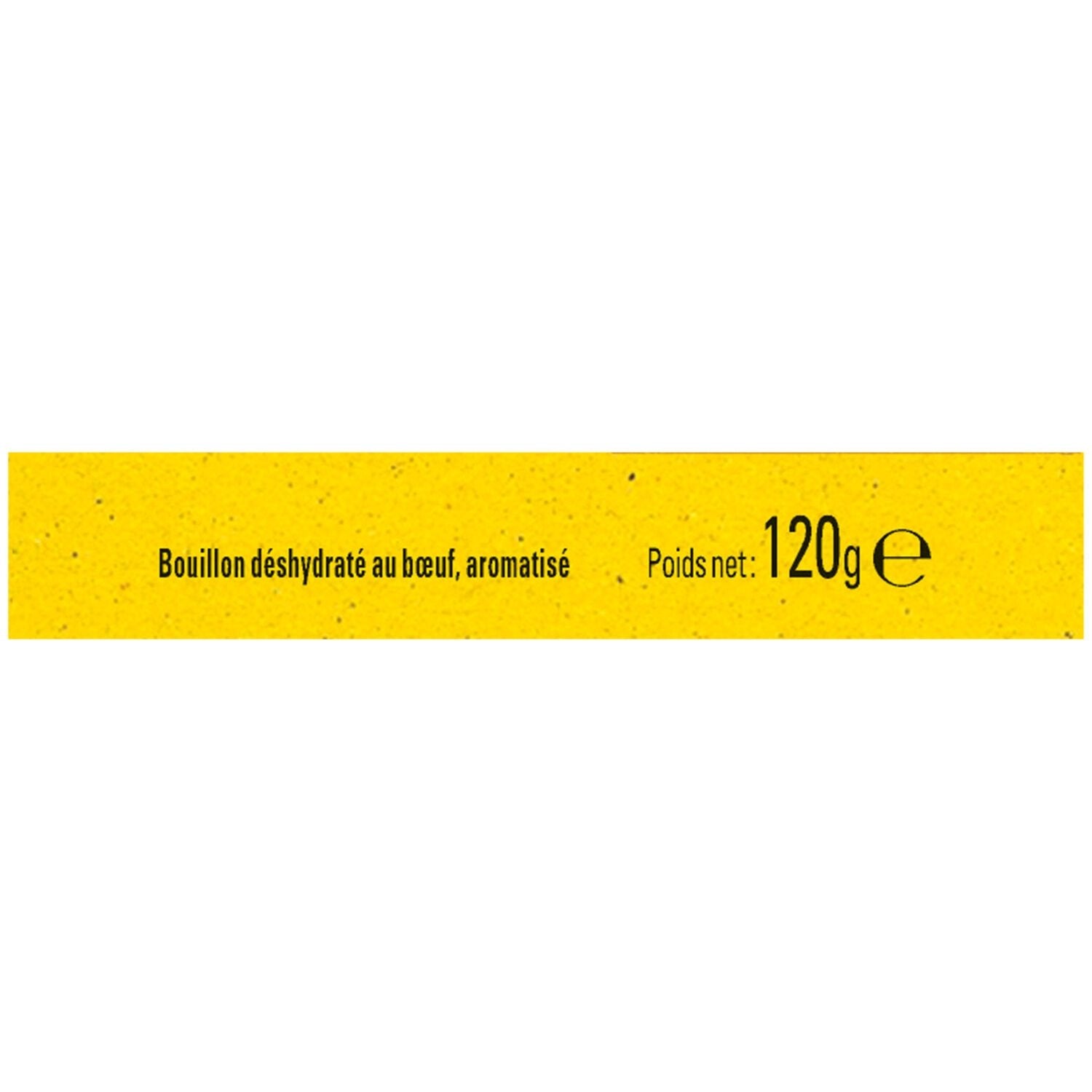 Zutaten: Jodsalz, Zucker, Stärke, Rindfleisch 8,7 %; Rinderfett, Rinderbratsaft 2,2 %; Gemüse 4,3 %; Zwiebeln 3 %, Karotten; Aromen, Salz, aromatische Pflanzen und Gewürze 0,9 %: Knoblauch, Petersilie, weißer Pfeffer, Nelken; Farbstoff: Zuckerkulör; Hefeextrakt, Antioxidationsmittel: Rosmarinextrakt; SELLERIE-Extrakt. Kann enthalten: EIER, MILCH, GLUTEN.