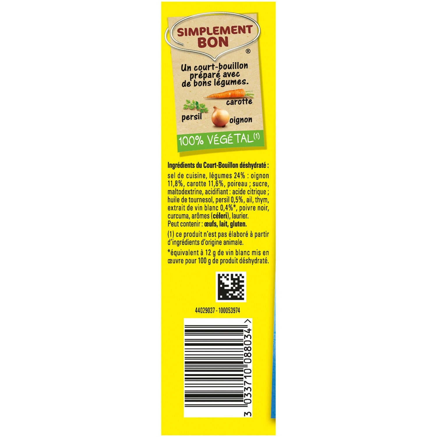 Zutaten: Kochsalz, Gemüse 24%: Zwiebeln 11,8%, Karotten 11,6%, Lauch; Zucker, Maltodextrin, Säuerungsmittel: Zitronensäure; Sonnenblumenöl, Petersilie 0,5%, Knoblauch, Thymian, Weißweinextrakt 0,4%*, schwarzer Pfeffer, Kurkuma, Aromen (SELLERIE), Lorbeerblatt. *entspricht 12 g Weißwein pro 100 g dehydriertem Produkt. Kann enthalten: EI, MILCH, GLUTEN.