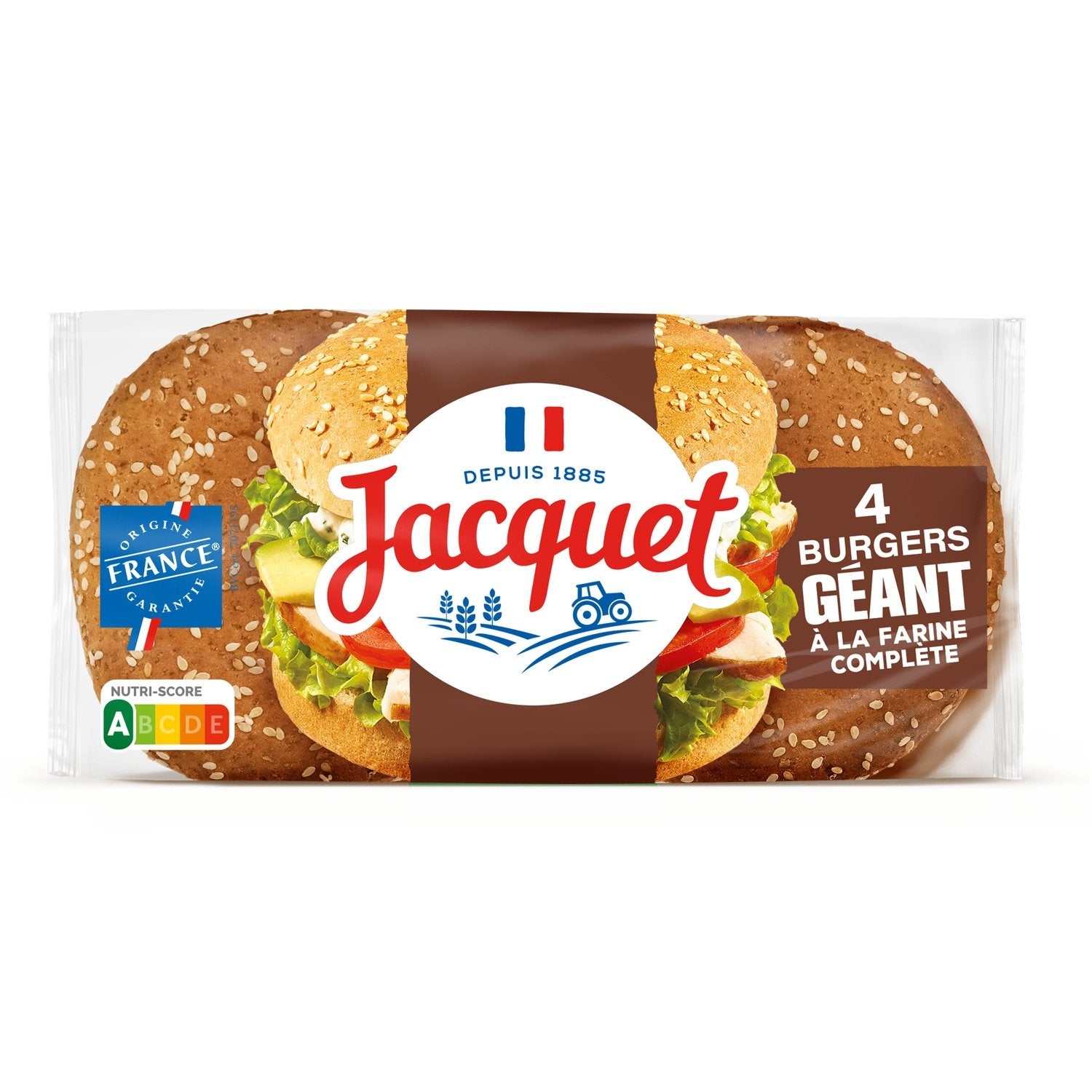 Giant Burger, der XXL-Genuss! Ein Vollkornrezept für die ganze Familie und Jacquet-Burgerbrötchen, die noch immer in Frankreich aus französischem Weizen hergestellt werden! Vorgeschnitten, bereit zum Befüllen mit den Zutaten Ihrer Wahl.