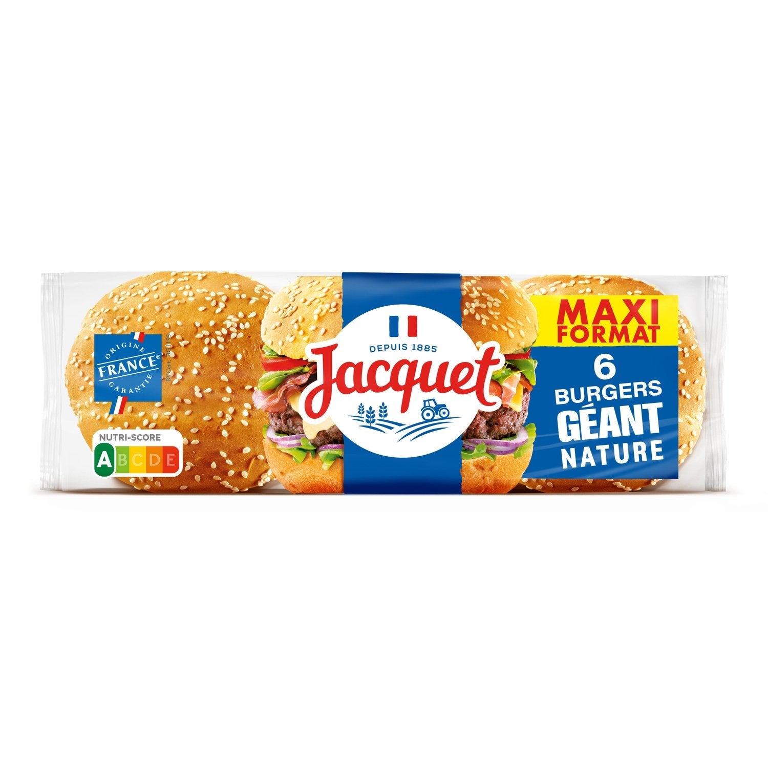 Giant Burger, der XXL-Genuss! Ein natürliches Rezept für die ganze Familie und Jacquet-Burgerbrötchen, immer in Frankreich aus französischem Weizen hergestellt! Vorgeschnitten, bereit zum Befüllen mit den Zutaten Ihrer Wahl.