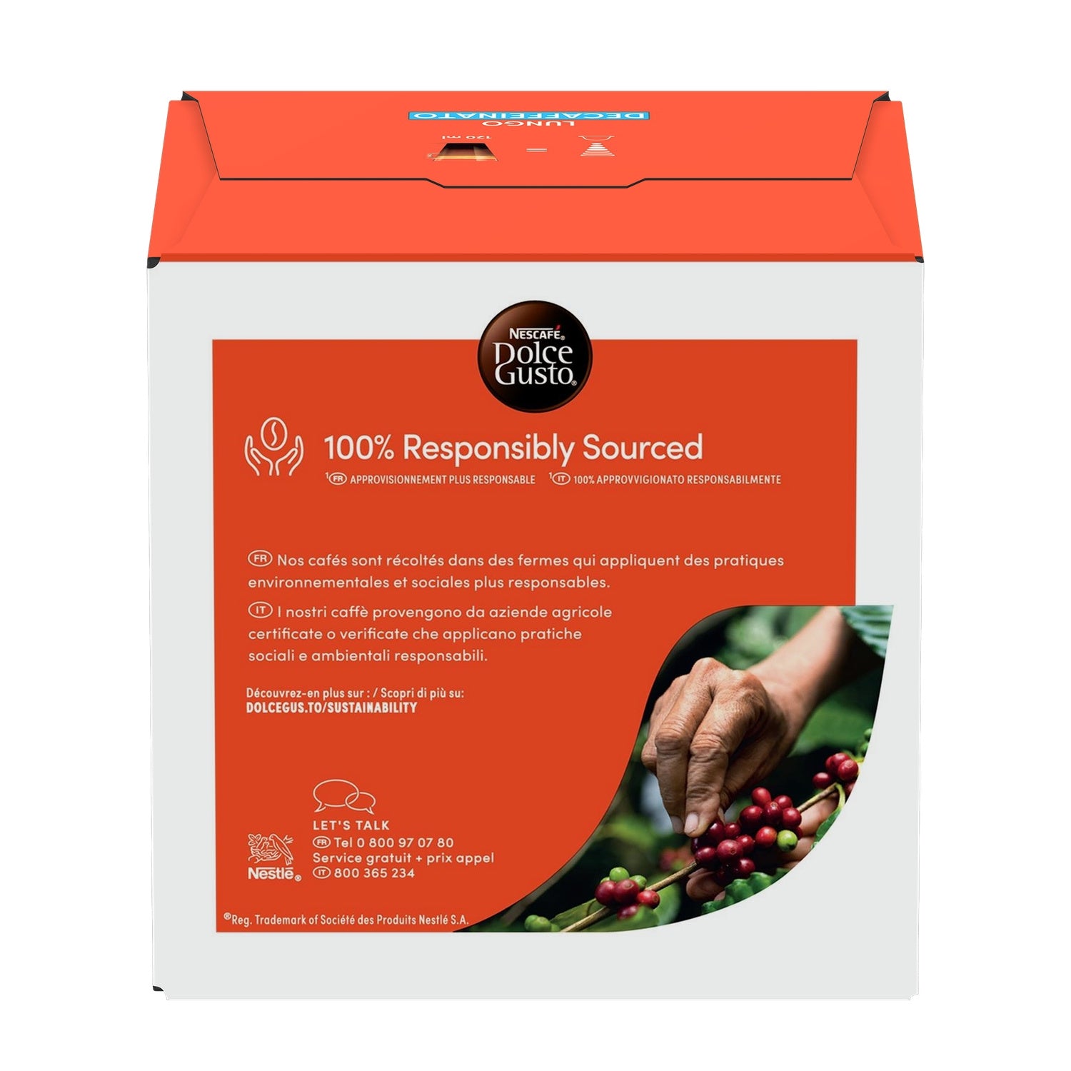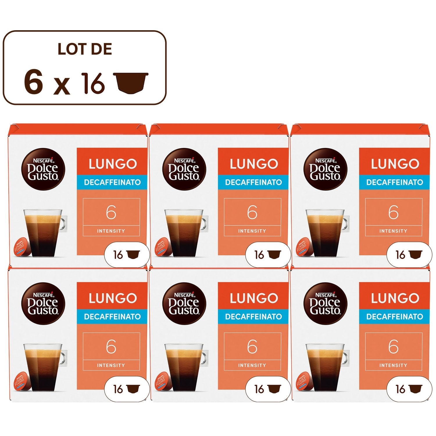 Ein 100 % dunkel gerösteter Arabica-Kaffee mit reichem Aroma und Noten von Brombeeren.,Vollmundig mit einer feinen und seidigen Crema, länger als ein Espresso (120 ml) und entkoffeiniert, Intensität 6.,Die Frische des Kaffees bleibt in einer luftdichten Kapsel erhalten, damit Sie die reichen Aromen in jeder Tasse genießen können.,96 Kapseln für 96 Tassen NESCAFE Dolce Gusto Lungo Decaffeinato.