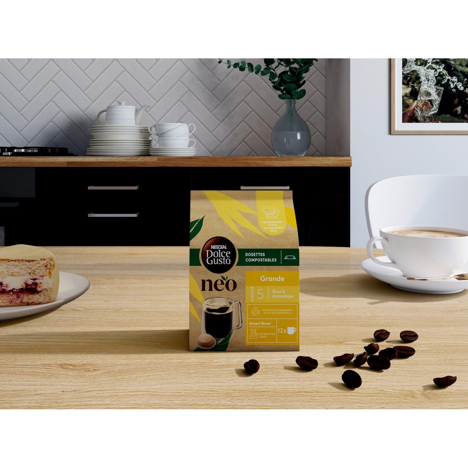 Genießen Sie den NESCAFÉ® Dolce Gusto® NEO Grande, eine große Tasse, perfekt für den Morgenkaffee. Mild und aromatisch, bietet dieser mittelstarke, abgerundete Kaffee vielfältige Fruchtnoten mit einem Hauch von Honig und Getreide. Dank der SlowBrew-Technologie genießen Sie ein Ergebnis, das Filterkaffee-Extraktionen ähnelt, aber den Komfort einer Kapsel bietet.