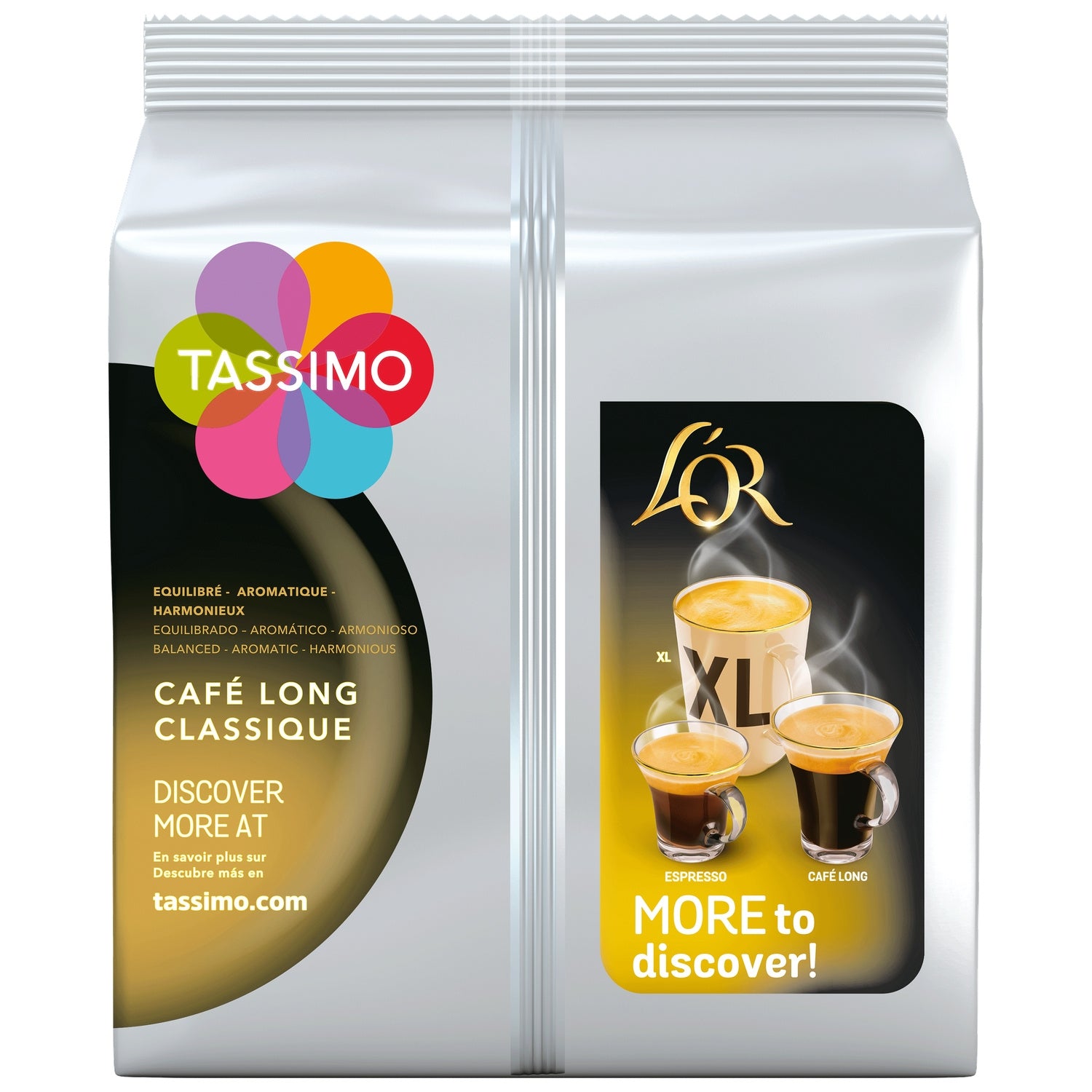 Packung mit 16 T-Disc-Pads, kompatibel mit TASSIMO-Maschinen. TASSIMO L'OR Long Classic ist ein langer, ausgewogener Kaffee mit cremigem Schaum.