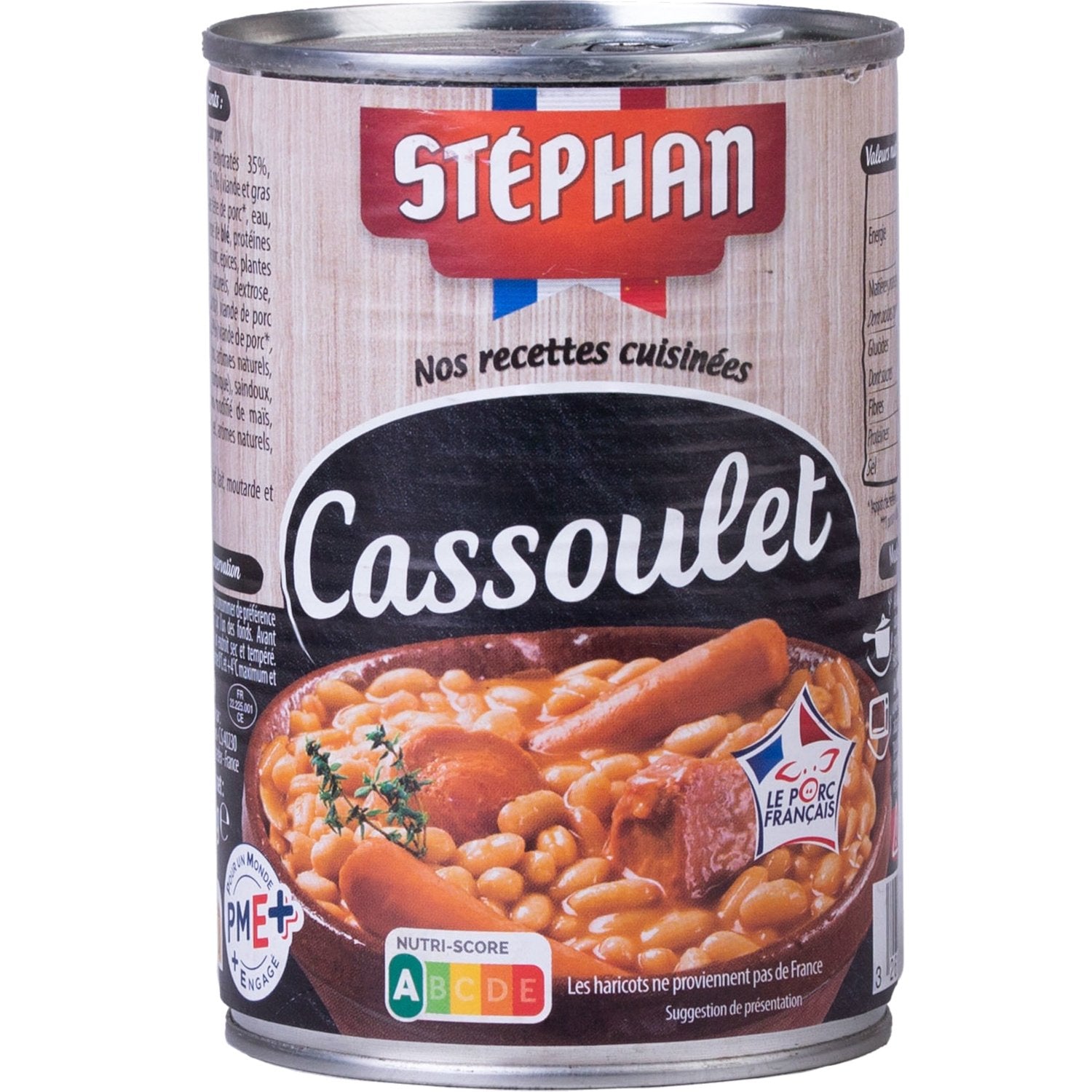 Wasser, rehydrierte weiße Bohnen 35 %, Würstchen 15,1 % (Schweinefleisch und -fett*, Stücke vom Schweinekopf*, Wasser, Schweineschwarten*, WEIZENmehl, SOJAproteine, Salz, Schweineplasma, Gewürze, aromatische Pflanzen, natürliche Aromen, Dextrose, natürliches Paprikaaroma), gepökeltes Schweinefleisch 6,9 % (Schweinefleisch*, Wasser, Salz, Schweineplasma, natürliche Aromen, Antioxidationsmittel: Ascorbinsäure), Schmalz, WEIZENmehl, modifizierte Maisstärke, Tomatenmark, Salz, natürliche Aromen, Knoblauch, Zucker, Pfeffer.