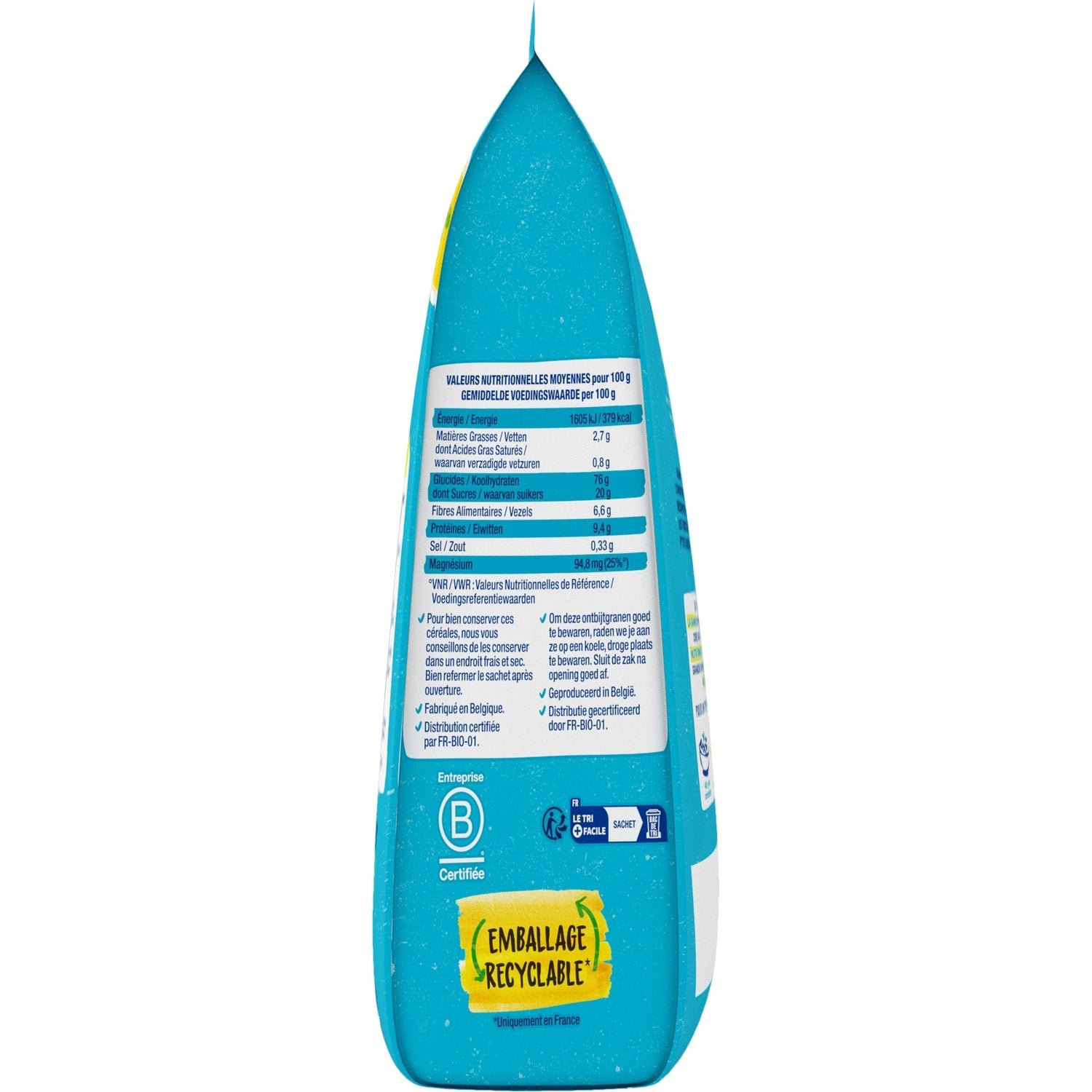 Vollkornmehl* 48,2%, Maismehl*, Reisgrieß*, Schokoladenpulver* 11,8% (unraffinierter Rohrzucker*, Kakaopulver*), Vollkornhafermehl* 9,2%, unraffinierter Rohrzucker*, Honig*, Salz. *Bio-Zutaten