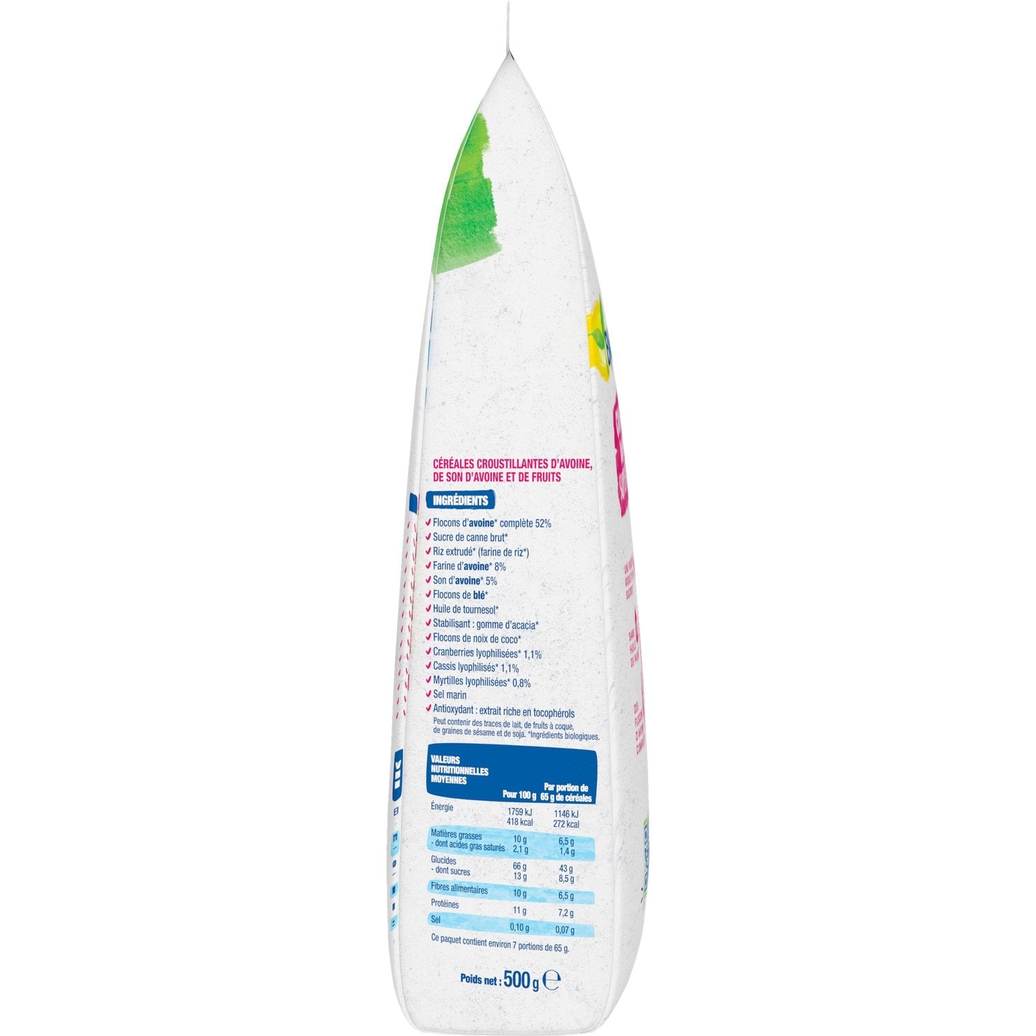 Vollkorn-Haferflocken* 52%, Rohrohrzucker*, extrudierter Reis* (Reismehl*), Hafermehl* 8%, Haferkleie* 5%, Weizenflocken*, Sonnenblumenöl*, Stabilisator: Akaziengummi*, Kokosflocken*, gefriergetrocknete Cranberries* 1,1%, gefriergetrocknete schwarze Johannisbeeren* 1,1%, gefriergetrocknete Heidelbeeren* 0,8%, Meersalz, Antioxidationsmittel: stark tocopherolhaltiger Extrakt.*Zutaten…