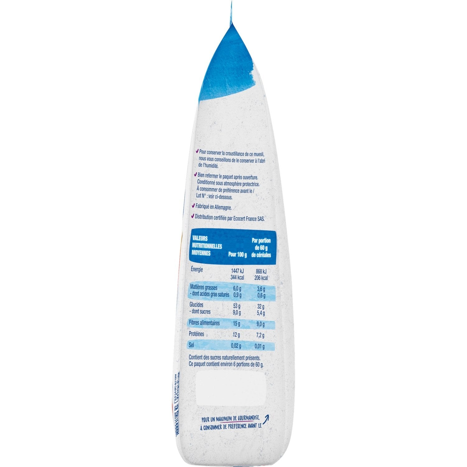 Damit das Müsli knusprig bleibt, empfehlen wir, es vor Feuchtigkeit geschützt aufzubewahren. / Nach dem Öffnen die Verpackung wieder gut verschließen.