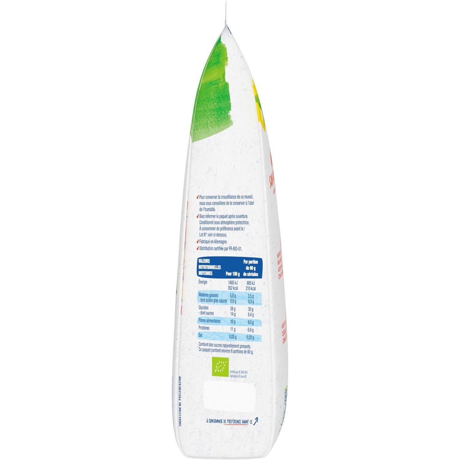 Vollkorn-Haferflocken*, Vollkorn-Weizenflocken*, Rosinen* 8% (Rosinen*, Sonnenblumenöl*), getrocknete Feigen* 8% (Feigen*, Reismehl*), Vollkorn-Dinkelflocken* (Weizen), Cornflakes*, Datteln* 4% (Datteln*, Reismehl*), getrocknete Aprikosen* 3% (Aprikosen*, Reismehl*), Sonnenblumenkerne*, Vollkorn-Dinkelflocken* (Weizen), Leinsamen*, Kürbiskerne*. *Zutaten aus biologischem Anbau. / Kann Spuren von MILCH, NÜSSEN, SESAM und SOJA enthalten.
