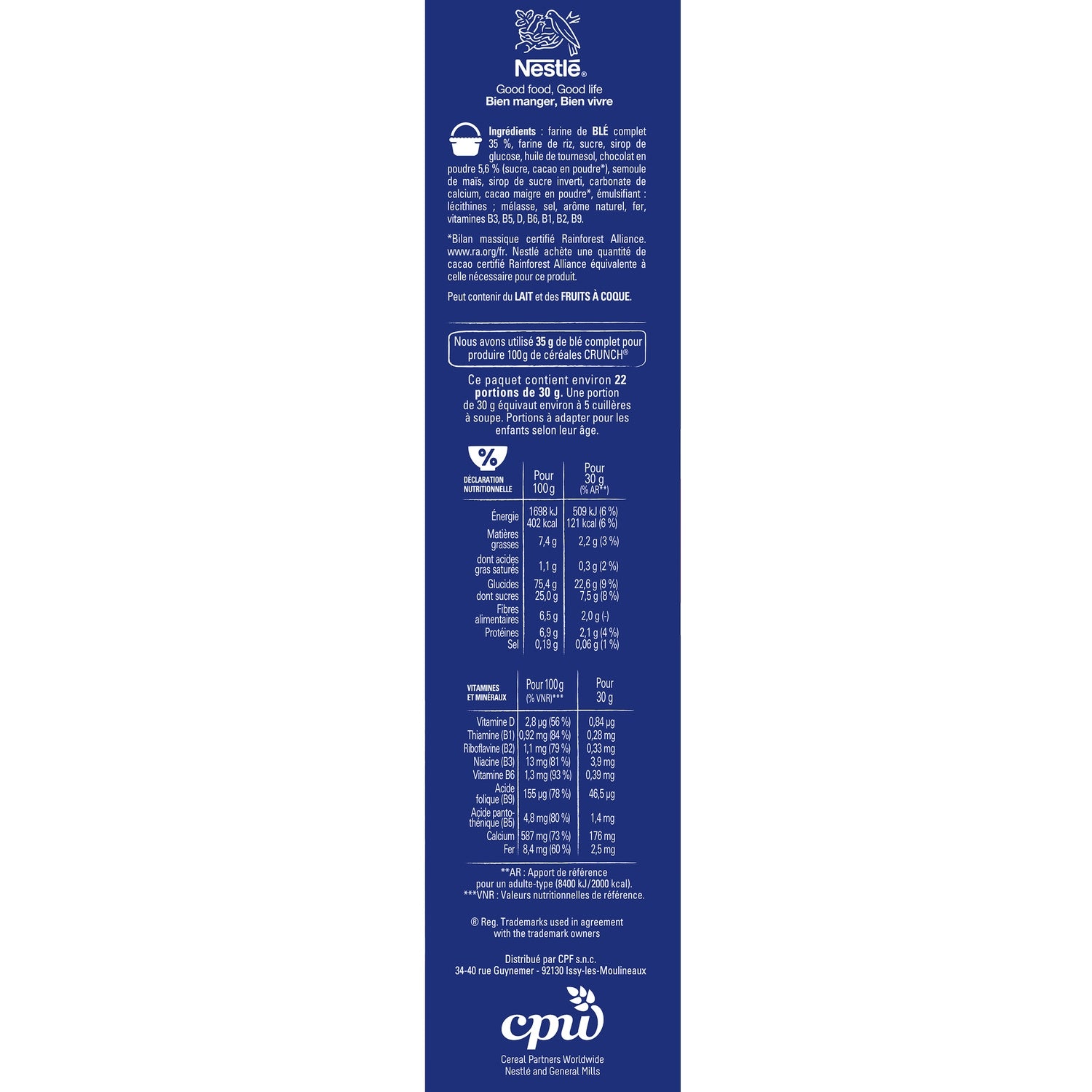 Zutaten: Vollkornmehl 35%, Reismehl, Zucker, Glukosesirup, Sonnenblumenöl, Schokoladenpulver 5,6% (Zucker, Kakaopulver*), Maisgrieß, Invertzuckersirup, Calciumcarbonat, fettarmes Kakaopulver*, Emulgator: Lecithine; Melasse, Salz, natürliches Aroma, Eisen, Vitamine B3, B5, D, B6, B1, B2, B9. *Rainforest Alliance-zertifizierte Massenbilanz. www.ra.org/fr.…