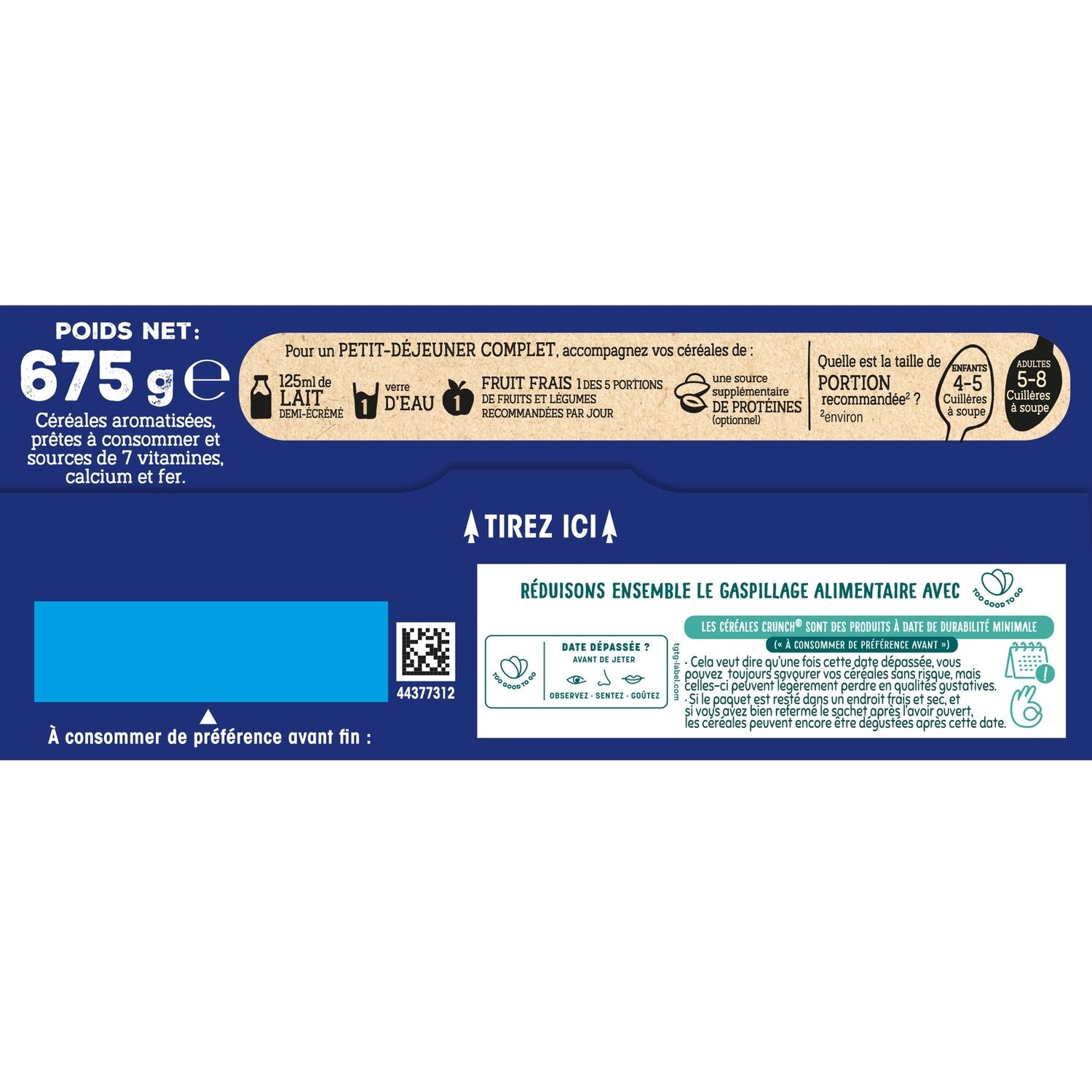 Crunch-Cerealien sind Produkte mit einem Mindesthaltbarkeitsdatum („Mindesthaltbarkeitsdatum“). Das bedeutet, dass Sie Ihr Müsli nach Ablauf dieses Datums weiterhin bedenkenlos genießen können, es jedoch leicht an Geschmack verlieren kann. Bei kühler und trockener Lagerung und ordnungsgemäßem Verschließen des Beutels nach dem Öffnen ist das Müsli auch nach Ablauf des Datums noch genießbar.