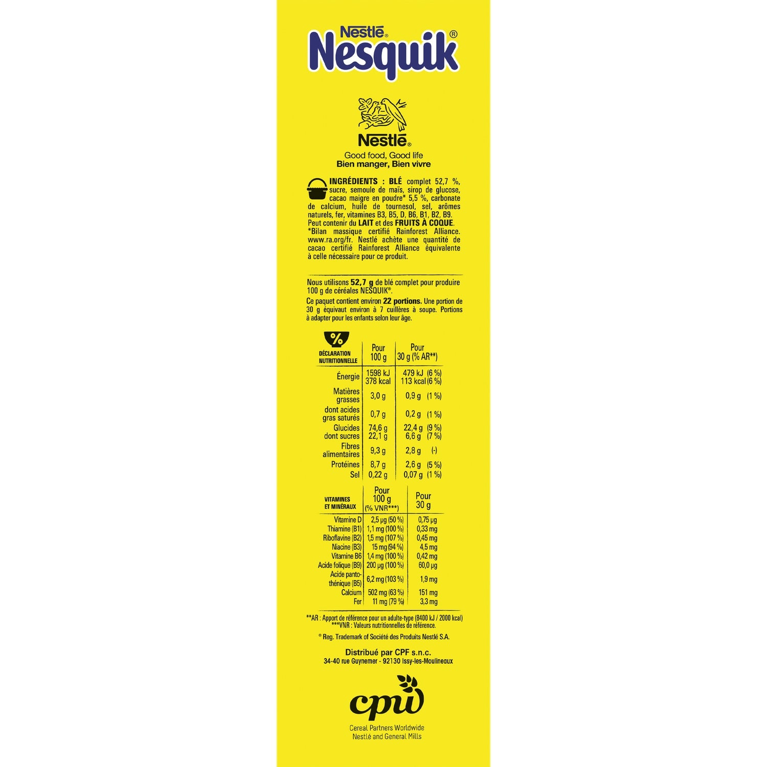 Zutaten: Vollkornmehl 52,7 %, Zucker, Maisgrieß, Glukosesirup, fettarmes Kakaopulver* 5,5 %, Calciumcarbonat, Sonnenblumenöl, Salz, natürliche Aromen, Eisen, Vitamine B3, B5, D, B6, B1, B2, B9. Kann MILCH und NÜSSE enthalten. *Rainforest Alliance-zertifizierte Massenbilanz. www.ra.org/fr. Nestlé kauft eine entsprechende Menge Rainforest Alliance-zertifizierten Kakao…