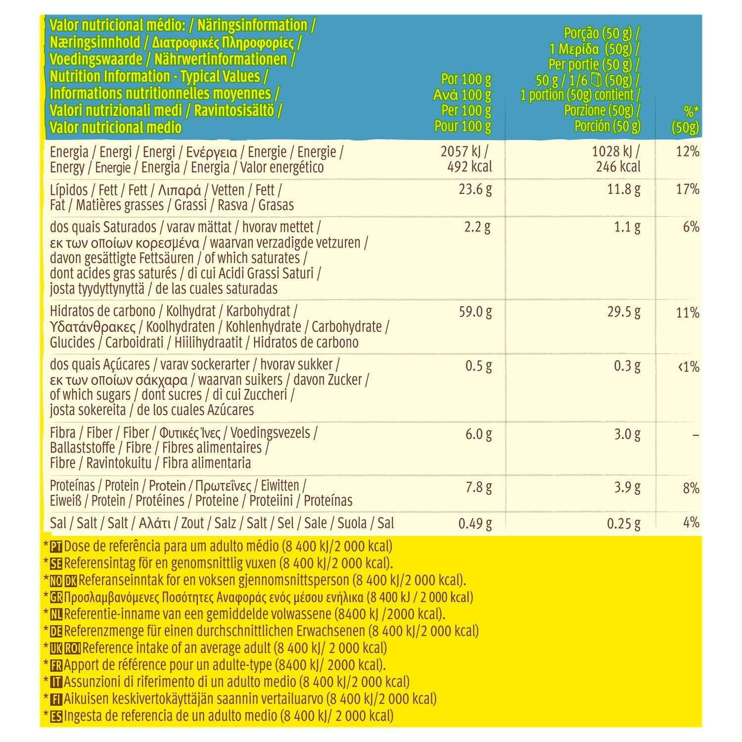 Brennwert (kJ): 609 kJ / 30 g (7 %) | Brennwert (kcal): 145 kcal / 30 g (7 %) | Fett: 6,8 g / 30 g (10 %) | Gesättigte Fettsäuren: 0,6 g / 30 g (3 %)
