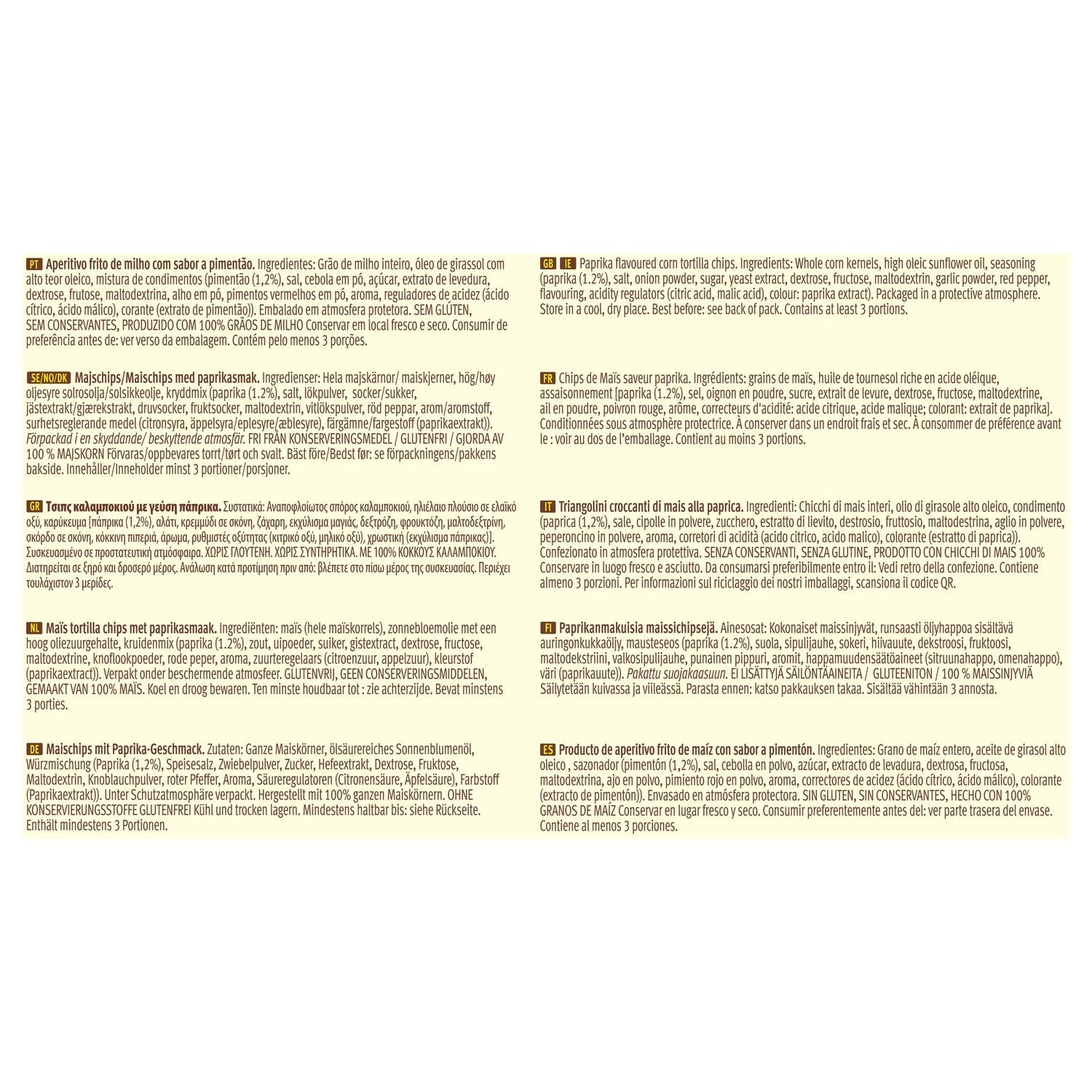 Maiskörner, Sonnenblumenöl mit hohem Ölsäuregehalt, Paprikagewürz (1,2%), Salz, Zwiebelpulver, Zucker, Hefeextrakt, Dextrose, Fruktose, Maltodextrin, Knoblauchpulver, rote Paprika, Aroma, Säureregulatoren: Zitronensäure, Apfelsäure, Farbstoff: Paprikaextrakt. Allergene: siehe Zutaten in GROSSBUCHSTABEN. KANN SOJA, SENF, ... ENTHALTEN.