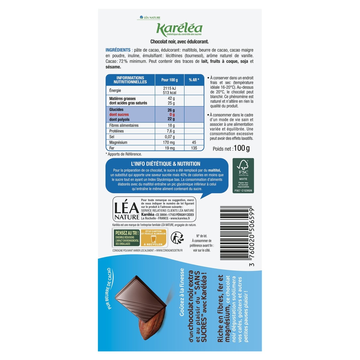 Probieren Sie die Finesse einer extra dunklen Schokolade und den Genuss von „ZUCKERFREI“ mit Karéléa! Reich an Ballaststoffen, Eisen und Magnesium, wird diese leckere dunkle Schokolade Ihren Kaffee, Snacks und andere kleine Genusspausen verfeinern! 72 % Kakao Reich an Ballaststoffen, Eisen und Magnesium Zuckerfrei Palmölfrei Reine Kakaobutter Zuckerfrei Reich an Ballaststoffen, Eisen und Magnesium