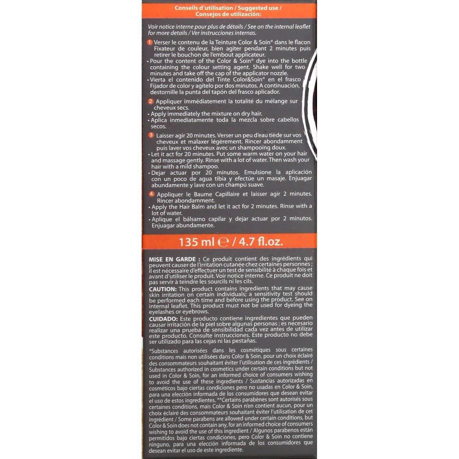 Tinktur: PEG-2-Oleamin, Aqua, Cocamide DEA, Alcohol Denat, Propylenglykol, Ethanolamin, Ölsäure, Natriumsulfit, Tetranatrium EDTA, hydrolysiertes Haferprotein, hydrolysiertes Sojaprotein, hydrolysiertes Maisprotein, hydrolysiertes Weizenprotein, Natriumerythorbat, p-Aminophenol, p-Phenylendiamin, 2-Methylresorcin, 4-Chlorresorcin, 4-Amino-2-hydroxytoluol. Fixativ: Aqua, Wasserstoffperoxid, Cetylalkohol, Ceteraylalkohol, Laureth-3, Ceteareth-20, Oxychinolinsulfat. Haarbalsam: Aqua, Cetearylalkohol, Glycerin, Behentrimoniummethosulfat, Citrus medica limonum-Fruchtwasser, hydrolysiertes Weizenprotein, Helianthus annuus-Blütenextrakt, Linum usitatissimum-Samenextrakt, Ceteareth-20, Cetylalkohol, Glycerylstearat, Ceteth-20, Steareth-20, Zitronensäure, Gossypium herbaceum-Samenöl, Xanthangummi, Parfüm, Limonen, Natriumbenzoat, Kaliumsorbat.