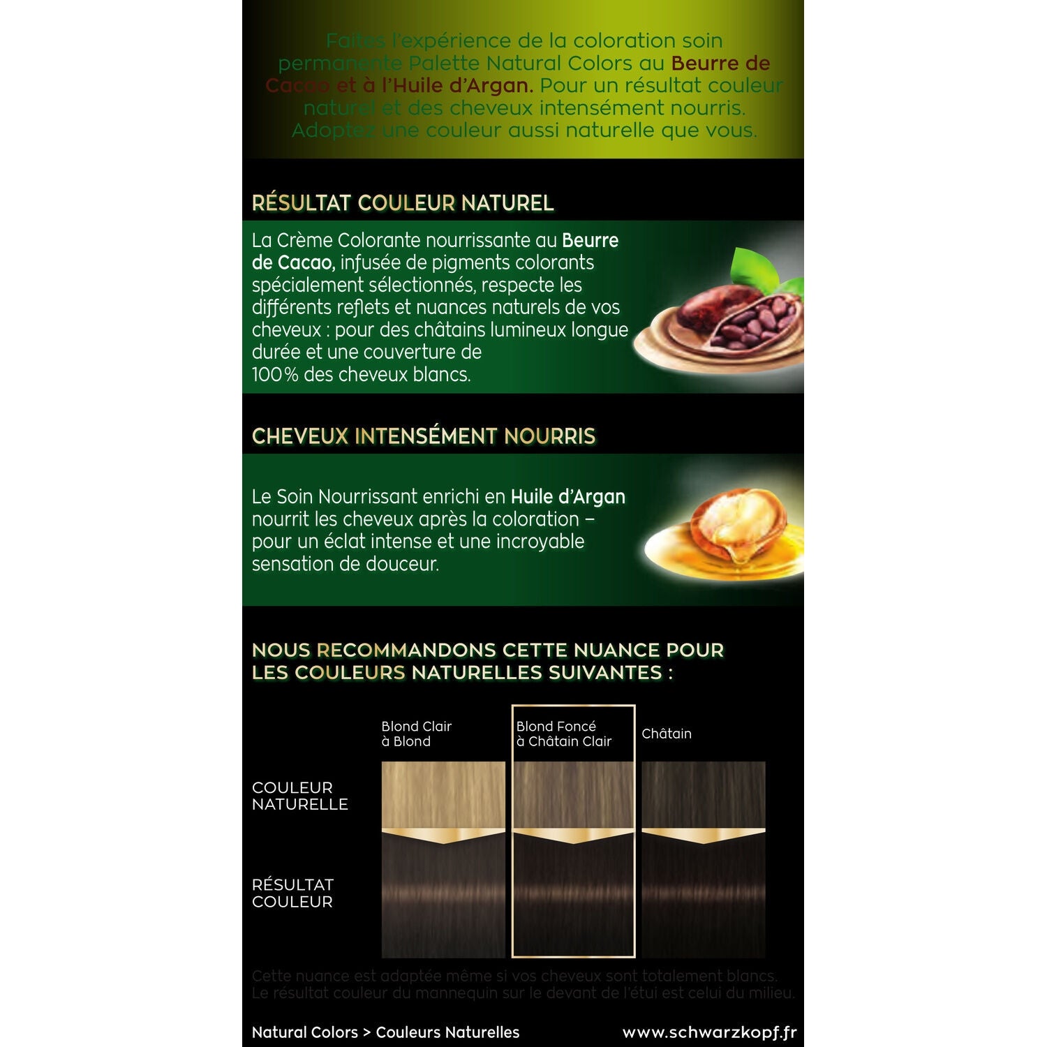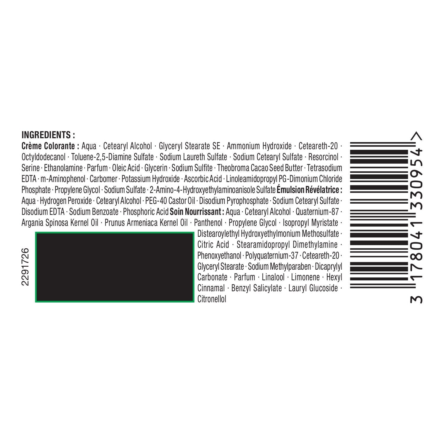 Colorationscreme: Aqua · Cetearyl Alcohol · Glyceryl Stearate SE · Ammoniumhydroxid · Ceteareth-20 · Octyldodecanol · Toluol-2,5-Diamine Sulfate · Sodium Laureth Sulfate · Sodium Cetearyl Sulfate · Resorcinol · Serin · Ethanolamin · Parfum · Ölsäure · Glycerin · NatriumSULFIT · Theobroma Cacao Seed Butter · Tetrasodium EDTA · m-Aminophenol · Carbomer · Kaliumhydroxid · Ascorbinsäure · Linoleamidopropyl PG-Dimonium Chloride Phosphate · Propylene Glycol · Natriumsulfat · 2-Amino-4-Hydroxyethylaminoanisole Sulfate Entwickleremulsion: Aqua · Wasserstoffperoxid · Cetearyl Alcohol · PEG-40 Castor Oil · Disodium Pyrophosphate · Sodium Cetearyl Sulfate · Disodium EDTA · Natriumbenzoat · Phosphorsäure Pflegende Pflege: Aqua · Cetearyl Alcohol · Quaternium-87 · Argania Spinosa Kernel Oil · Prunus Armeniaca Kernel Oil · Panthenol · Propylenglykol · Isopropylmyristat · Distearoylethyl Hydroxyethylmonium Methosulfat · Zitronensäure · Stearamidopropyl Dimethylamine · Phenoxyethanol · Polyquaternium-37 · Ceteareth-20 · Glyceryl Stearate · Sodium Methylparaben · Dicaprylyl Carbonate · Parfum · Linalool · Limonen · Hexyl Cinnamal · Benzyl Salicylate · Lauryl Glucoside · Citronellol