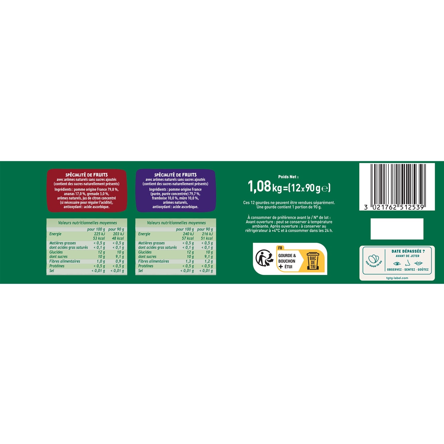 Apfel-Himbeere-Brombeere: Apfel (Püree, Püreekonzentrat) 79,7 %, Himbeere 10,0 %, Brombeere 10,0 %, natürliche Aromen, Antioxidationsmittel: Ascorbinsäure. Apfel-Ananas-Granatapfel: Apfel 79,8 %, Ananas 17,0 %, Granatapfel 3,0 %, natürliche Aromen, Zitronensaftkonzentrat (ggf. zur Säureregulierung), Antioxidationsmittel: Ascorbinsäure.