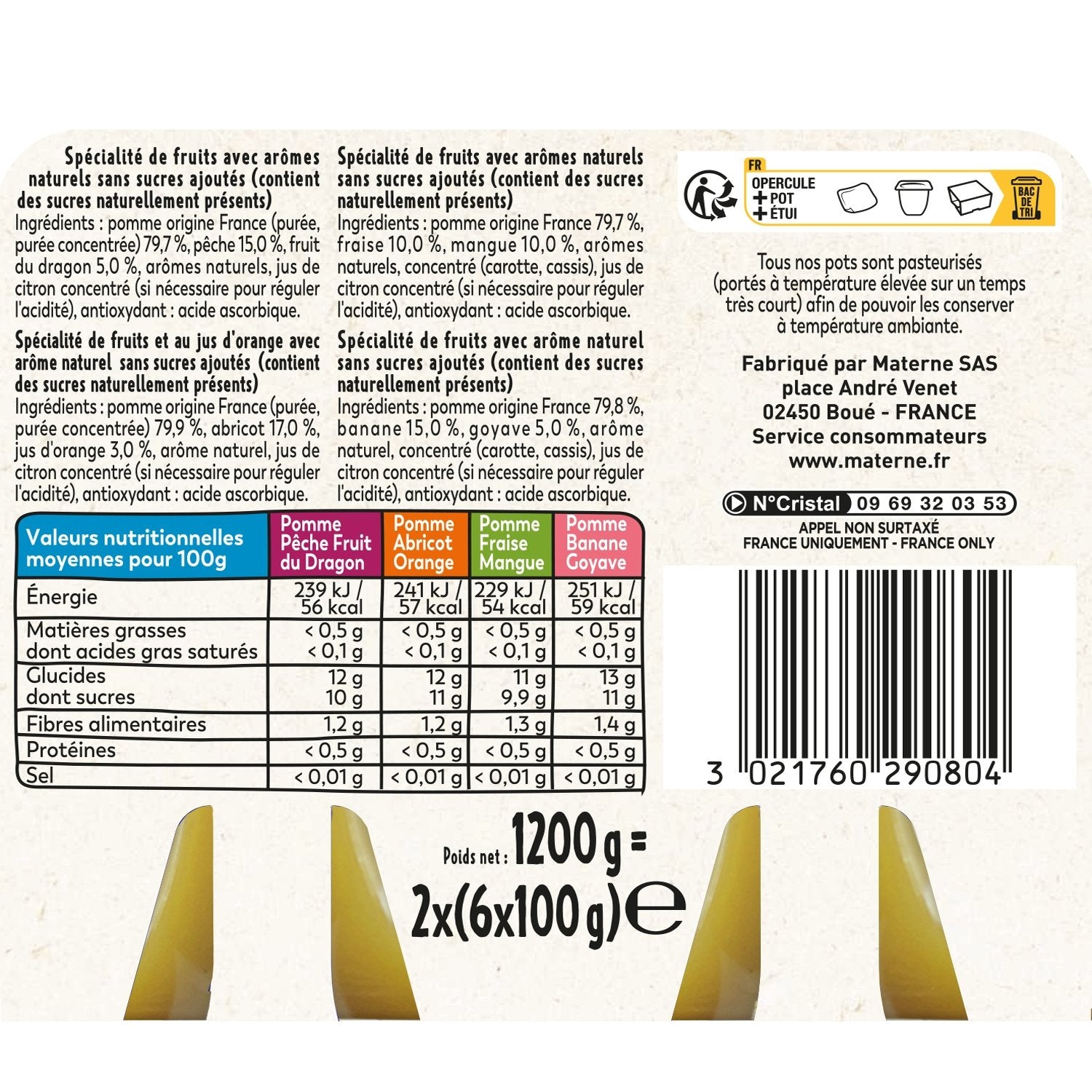 Apfel-Pfirsich-Drachenfrucht: Apfel aus Frankreich (Püree, konzentriertes Püree) 79,7 %, Pfirsich 15,0 %, Drachenfrucht 5,0 %, natürliche Aromen, konzentrierter Zitronensaft (ggf. zur Säureregulierung), Antioxidationsmittel: Ascorbinsäure. Apfel-Aprikose-Orange: Apfel aus Frankreich (Püree, konzentriertes Püree) 79,9 %, Aprikose 17,0 %, Orangensaft 3,0 %, natürliches Aroma, konzentrierter Zitronensaft (ggf.…