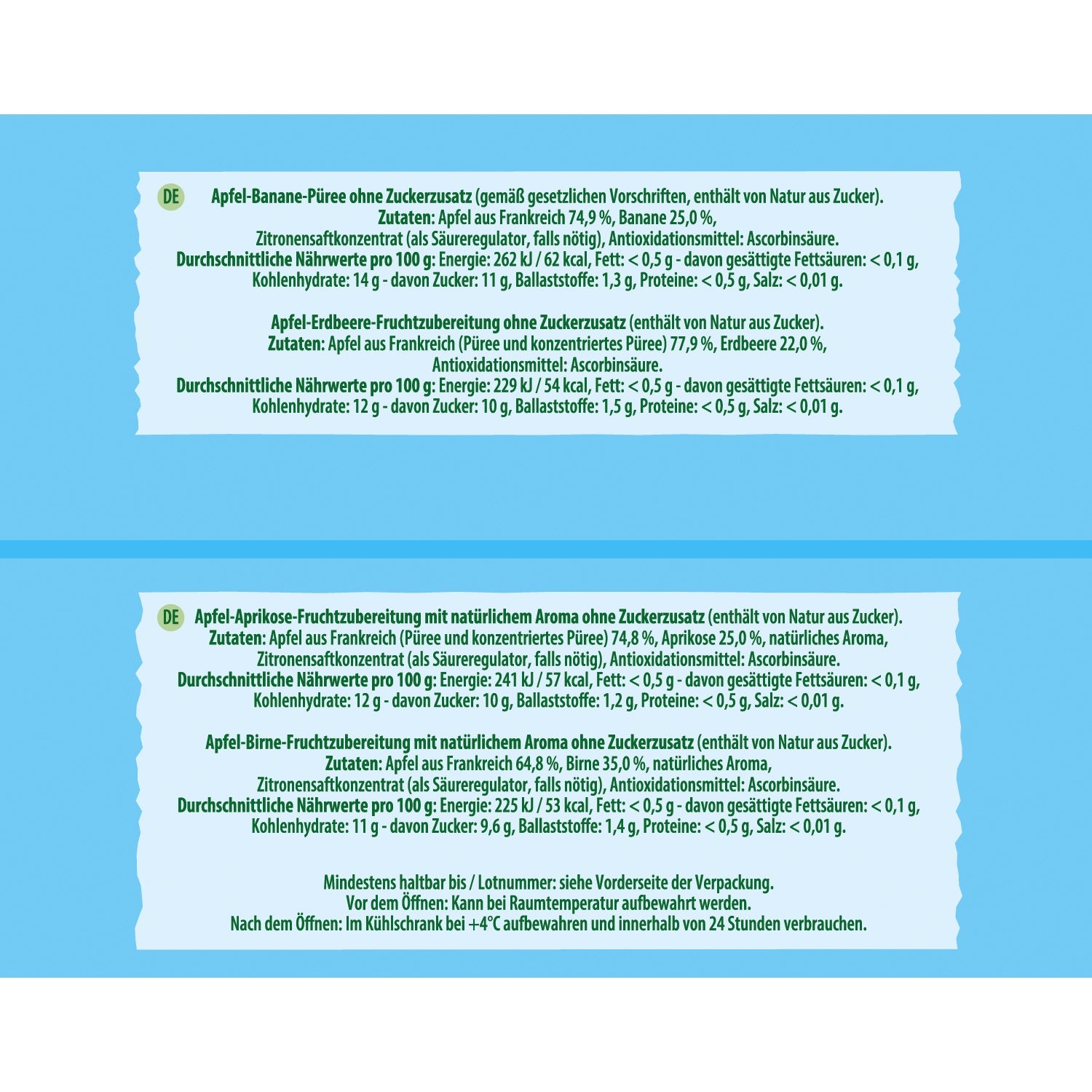 Erdbeer-Apfel-Spezialität ohne Zuckerzusatz (enthält von Natur aus Zucker). Birne-Apfel-Spezialität mit natürlichem Aroma ohne Zuckerzusatz (enthält von Natur aus Zucker). Aprikose-Apfel-Spezialität mit natürlichem Aroma ohne Zuckerzusatz (enthält von Natur aus Zucker). Bananen-Apfel-Püree ohne Zuckerzusatz (enthält von Natur aus Zucker gemäß den Vorschriften).