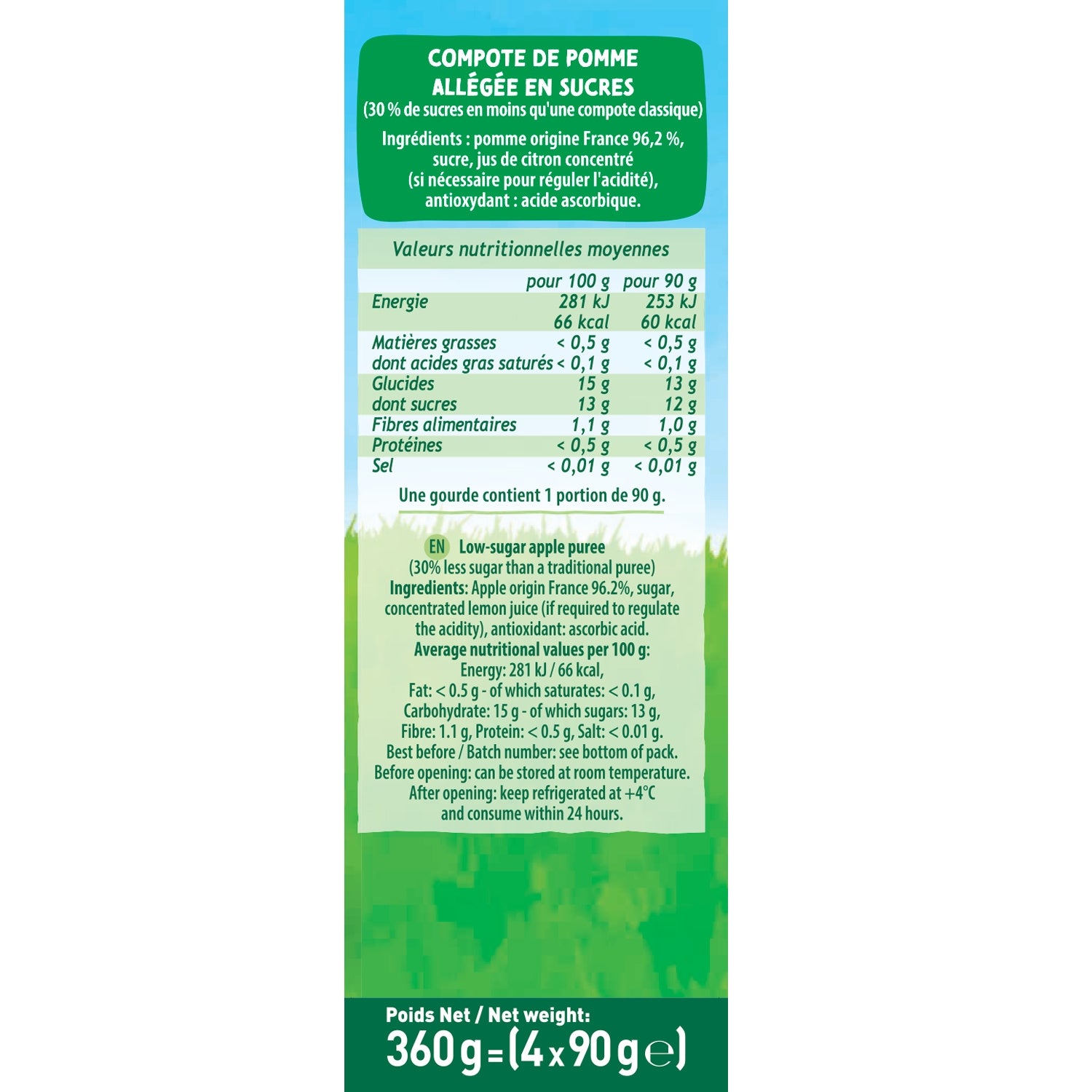Äpfel aus Frankreich 96,2 %, Zucker, konzentrierter Zitronensaft (ggf. zur Säureregulierung), Antioxidationsmittel: Ascorbinsäure.
