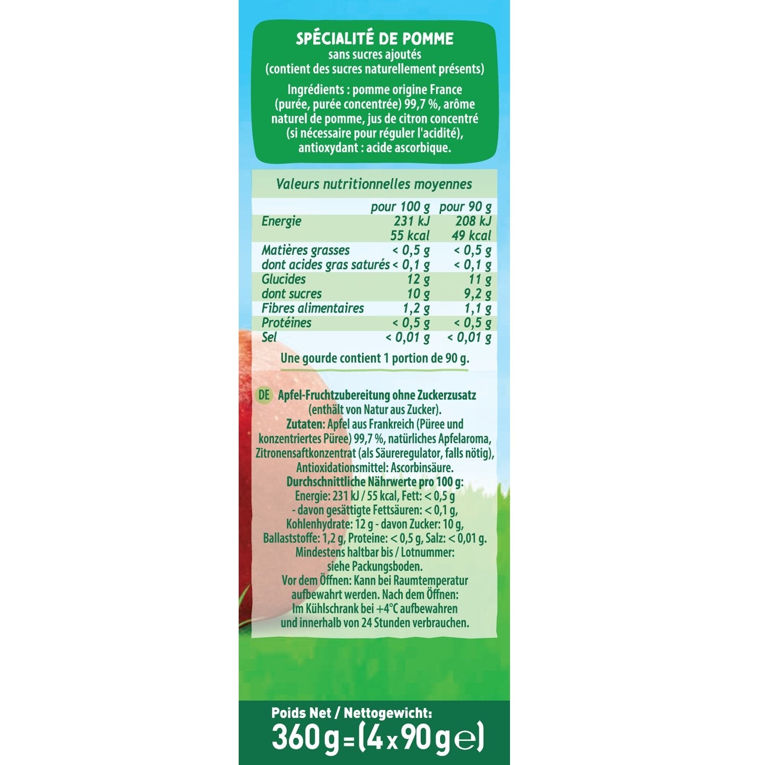 Äpfel aus Frankreich 99,7 % (Püree und Püreekonzentrat), natürliches Apfelaroma, Zitronensaftkonzentrat (ggf. zur Säureregulierung), Antioxidationsmittel: Ascorbinsäure.