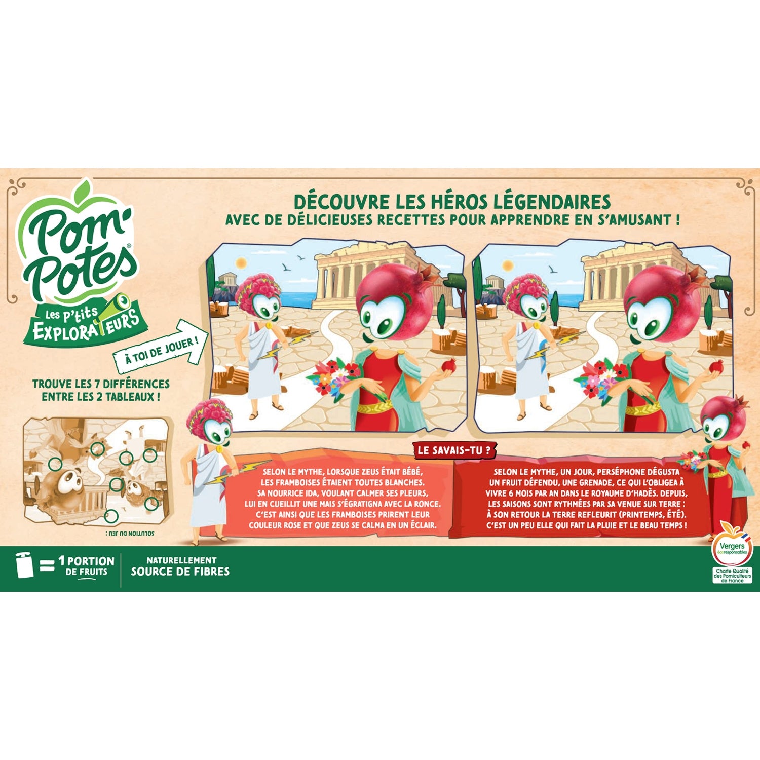Entdecken Sie Pom'Potes® Les P'tits Explorateurs, eine unterhaltsame und lehrreiche Auswahl an Kompotten in Beuteln, die Ihre Kinder mit den größten Mythen und Legenden vertraut machen dank: - leckeren Rezepten mit einer Frucht, die mit dem Mythos oder seiner Epoche in Verbindung steht; - einer unterhaltsamen und lehrreichen Verpackung, die die Geschichte des Mythos erzählt. Pom'Potes® Les P'tits Explorateurs bietet außerdem: - Rezepte ohne Zuckerzusatz*; - Ein Pom'Potes®-Beutel entspricht 1 der 5 empfohlenen Portionen Obst und Gemüse pro Tag. *Enthält von Natur aus Zucker