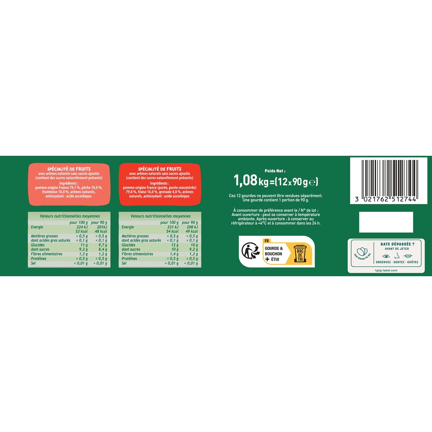 Apfel-Pfirsich-Himbeere: Apfel aus Frankreich 79,7 %, Pfirsich 10,0 %, Himbeere 10,0 %, natürliche Aromen, Antioxidationsmittel: Ascorbinsäure. Apfel-Erdbeere-Granatapfel: Apfel aus Frankreich (Püree, konzentriertes Püree) 79,8 %, Erdbeere 16,0 %, Granatapfel 4,0 %, natürliche Aromen, Antioxidationsmittel: Ascorbinsäure.