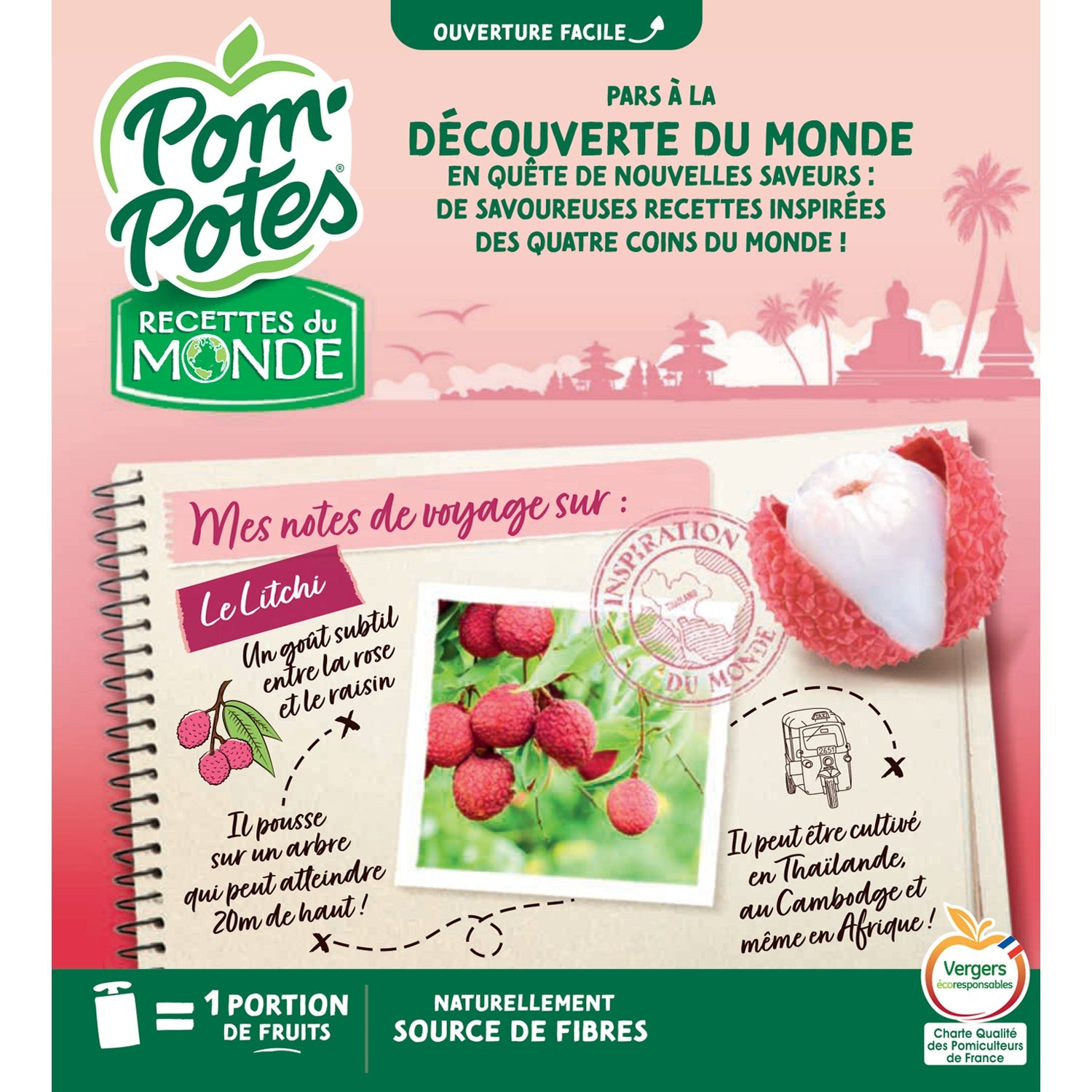 Pom'Potes® Recettes Du Monde: Endlich Fruchtbeutel für den großen Hunger! Pom'Potes lädt Sie ein, eine Pause einzulegen und ein Rezept aus einer anderen Welt zu genießen. Erleben Sie die Aromen Bangkoks mit einem Hauch Litschi! - Ohne Zuckerzusatz (enthält von Natur aus Zucker) - Ohne künstliche Aromen - Nutriscore A