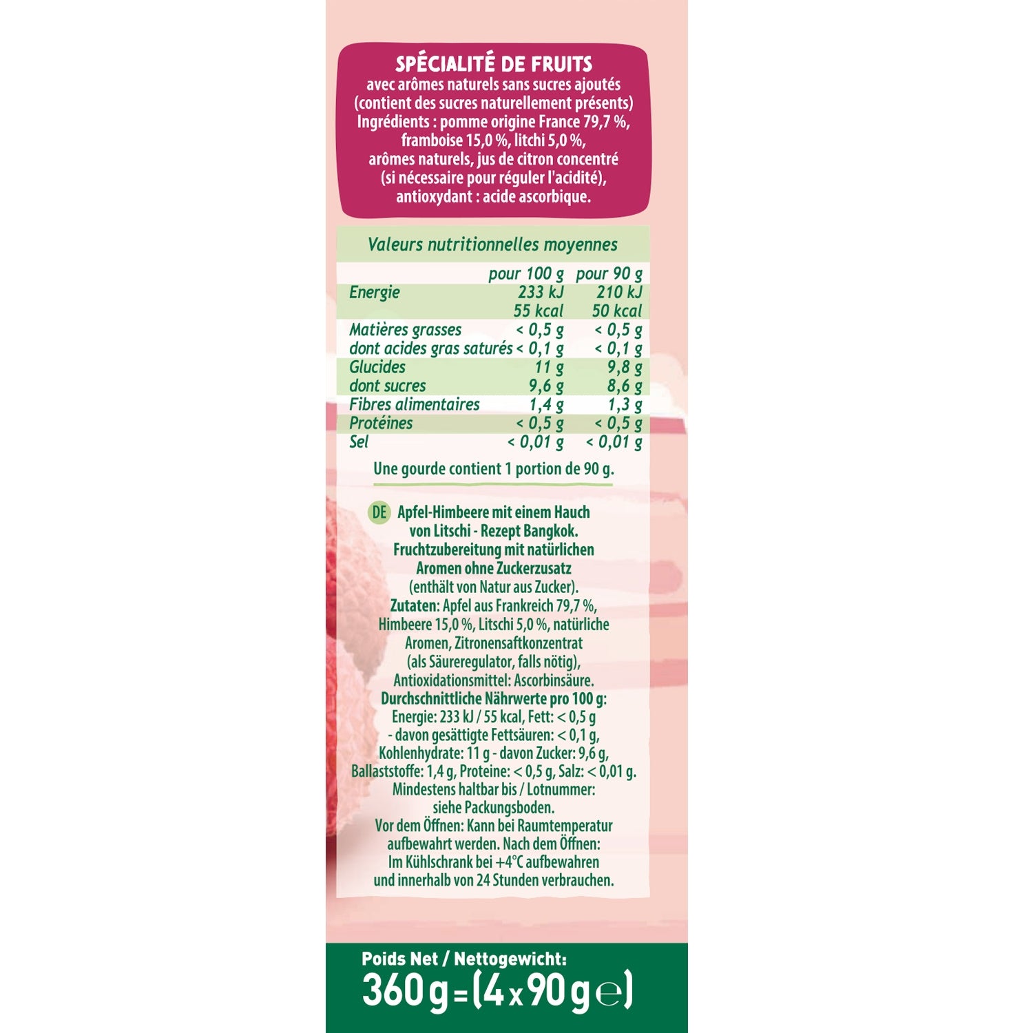 Apfel aus Frankreich 79,7 %, Himbeere 15,0 %, Litschi 5,0 %, natürliche Aromen, konzentrierter Zitronensaft (ggf. zur Säureregulierung), Antioxidationsmittel: Ascorbinsäure.