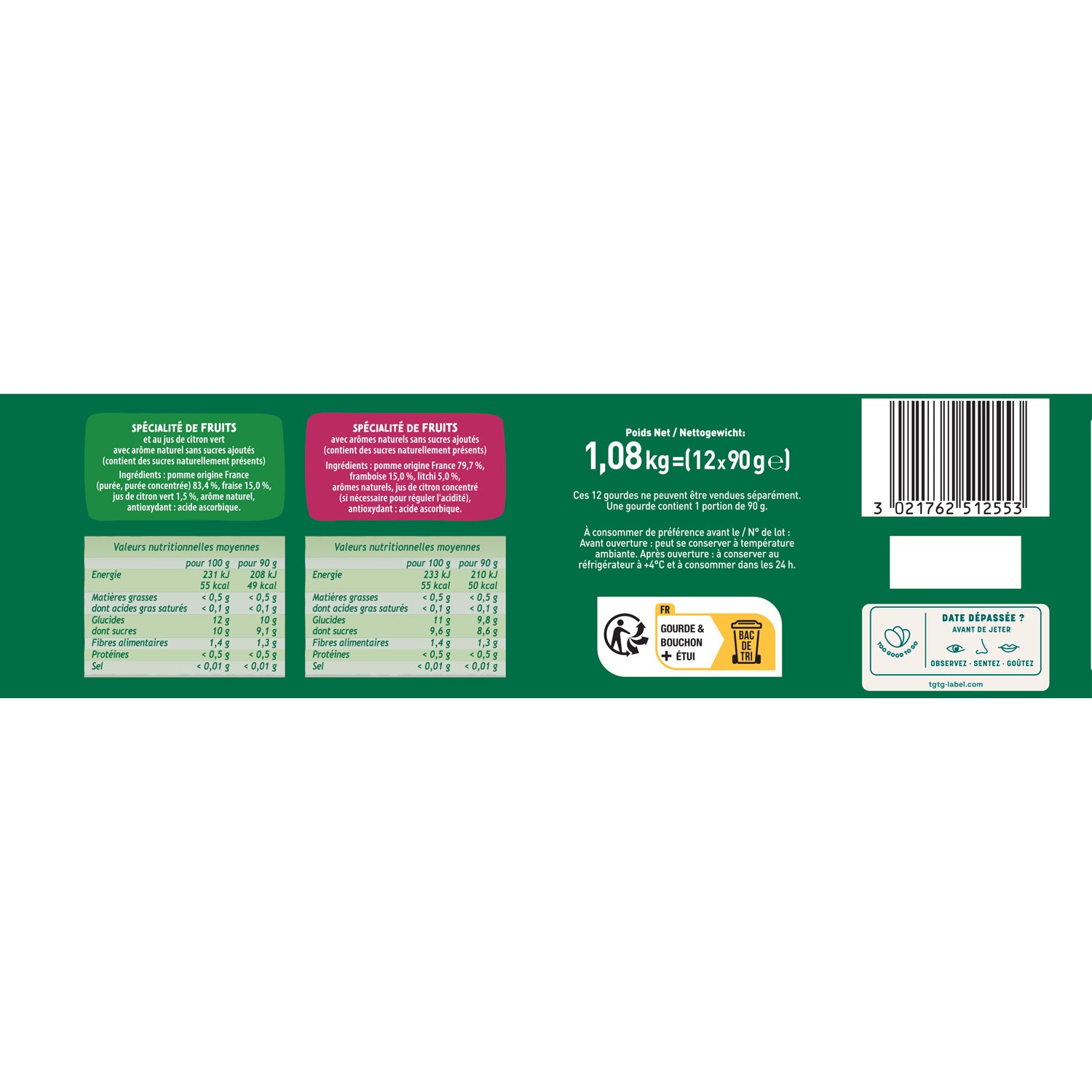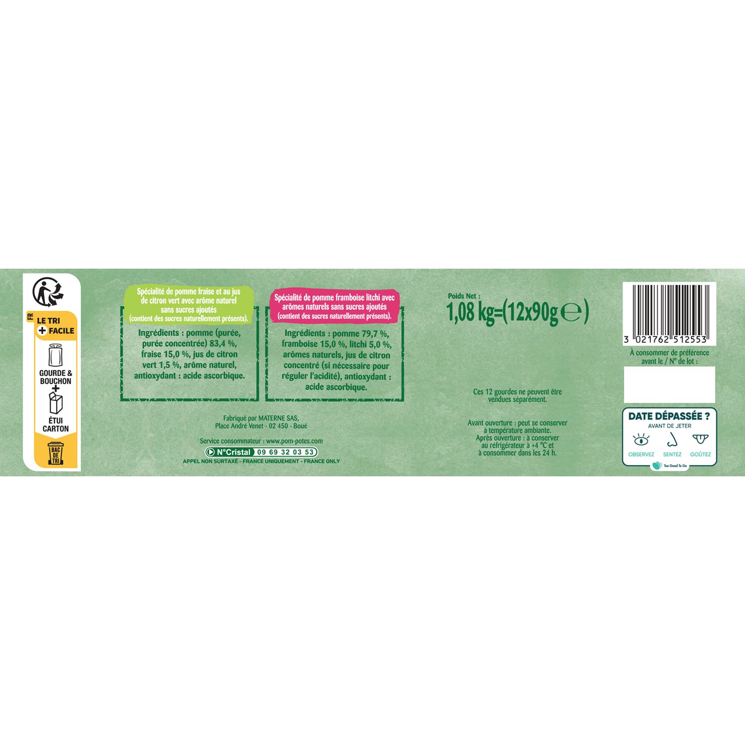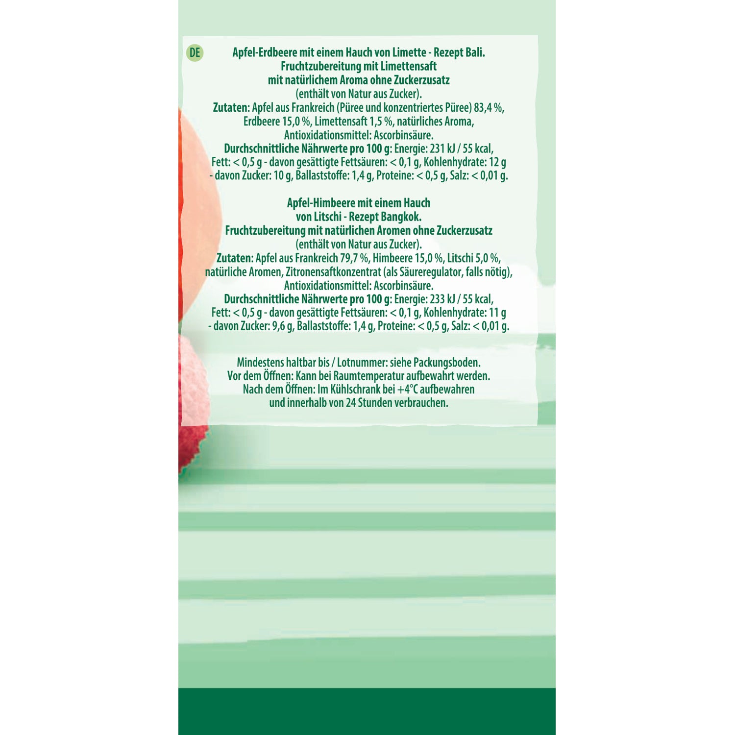 Apfel-Erdbeere-Limette: Apfel aus Frankreich (Püree, Püreekonzentrat) 83,4 %, Erdbeere 15,0 %, Limettensaft 1,5 %, natürliches Aroma, Antioxidationsmittel: Ascorbinsäure. Apfel-Himbeere-Lychee: Apfel aus Frankreich 79,7 %, Himbeere 15,0 %, Litschi 5,0 %, natürliche Aromen, Zitronensaftkonzentrat (ggf. zur Säureregulierung), Antioxidationsmittel: Ascorbinsäure.