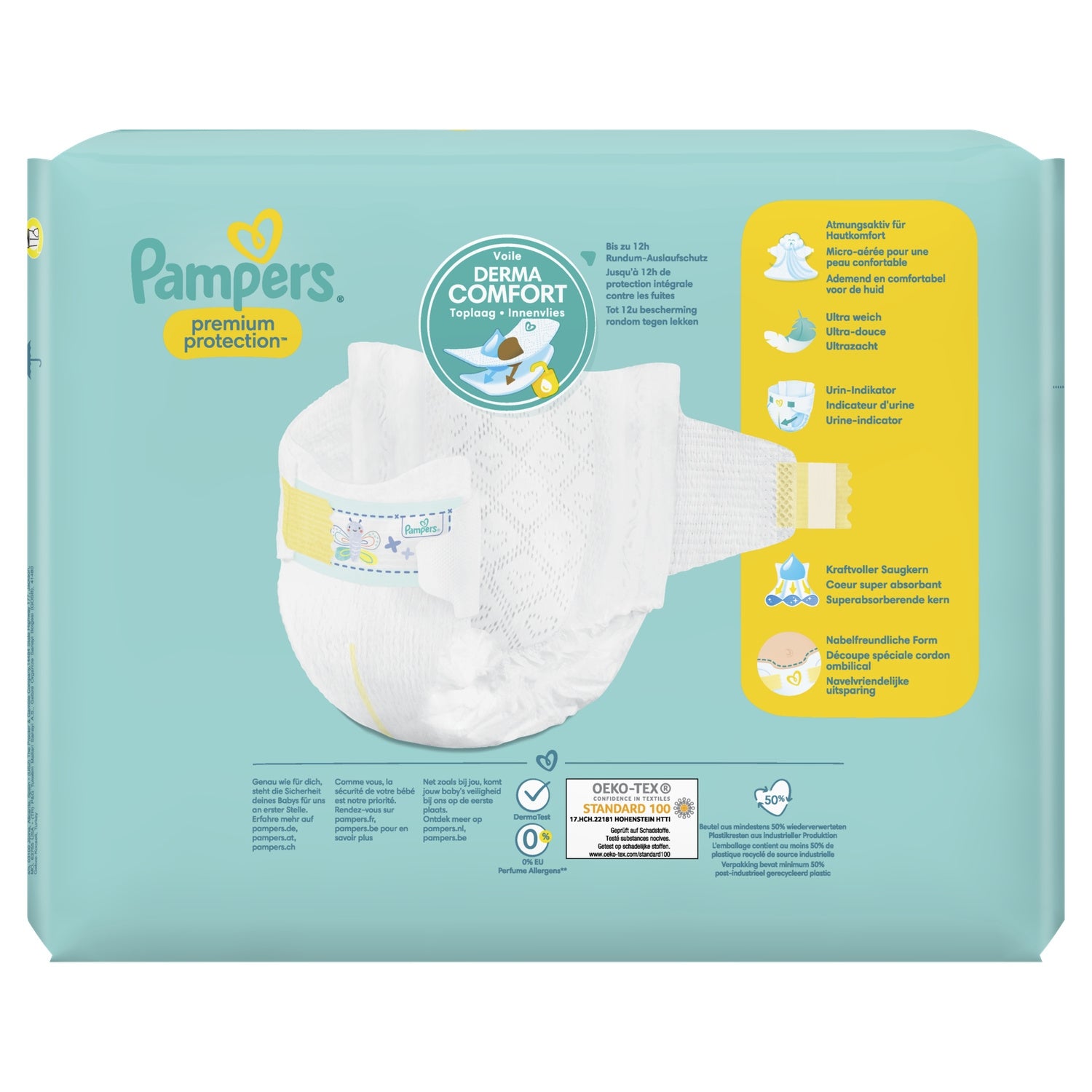 Pampers Nr. 1 Windeln für Komfort und Schutz empfindlicher Haut. Längerer Kontakt mit Nässe und weichem Stuhl kann den Zustand der empfindlichen Haut Ihres Babys beeinträchtigen und zu Unbehagen oder Unruhe bei Ihrem Baby führen. Pampers Premium Protection Windeln sind besonders weich und schützen gleichzeitig die empfindliche Haut Ihres Babys. Dies erreichen sie durch 1) eine einzigartige Dermacomfort-Wabenschicht, die Nässe und weichen Stuhl sofort von der Haut abweist und in der Windel hält. So bleibt die zarte Haut Ihres Babys trocken und geschützt; 2) Millionen von Mini-Ventilen ermöglichen zudem eine freie Luftzirkulation in der Windel, um die Haut trocken zu halten; 3) Bis zu 100 % Auslaufschutz dank eines Dreifach-Schutzsystems, das Flüssigkeit schnell aufsaugt und Auslaufen an Taille und Beinen verhindert; 4) ultraweiche Materialien, die Ihr Baby in eine Wolke aus Komfort und Schutz hüllen. Pampers Premium Protection Windeln, die erste Wahl in Entbindungsstationen in Frankreich*, sind 100 % sicher für die Haut Ihres Babys. Sie sind dermatologisch getestet und enthalten keine von der EU gelisteten Duftallergene.