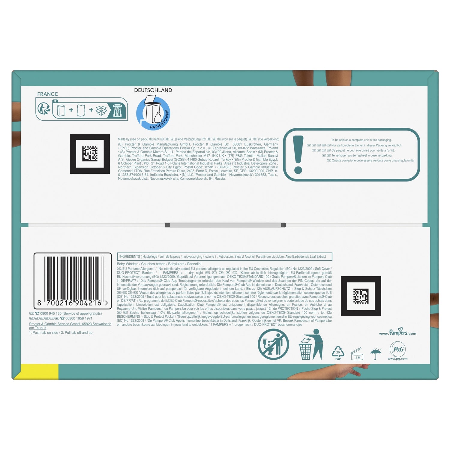 Stop & Protect-Tasche zum Auffangen von Leckagen an der Rückseite der Windel. Eine angenehme Nacht, bis zu 100 % auslaufsicher. Die ComfortTouch-Außenschicht umhüllt Ihr Baby sanft. Dermatologisch getestet. 0 % in der EU gelistete Duftstoffallergene (gemäß EU-Kosmetikverordnung Nr. 1223/2009). Die besonders saugfähige Schicht nimmt Feuchtigkeit schnell auf. Dehnbare Verschlüsse sorgen für einen bequemen Sitz und Auslaufbarrieren verhindern Auslaufen an den Beinen. Getestet und zertifiziert nach Standard 100 von OEKO-TEX