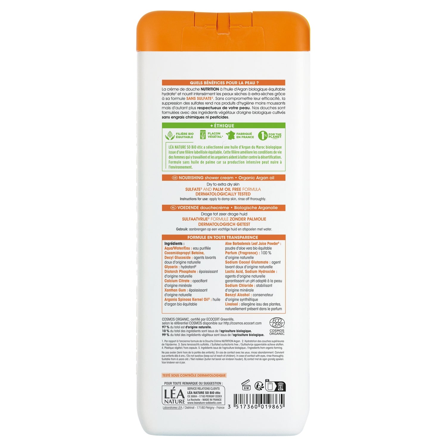 COSMOS ORGANIC, zertifiziert durch ECOCERT Greenlife. 97 % der gesamten Inhaltsstoffe sind natürlichen Ursprungs. 0 % Sulfat* und Palmöl. + ETHISCH: - Fairtrade-Bio-Sektor: LEA NATURE SO'BiO étic hat Bio-Argan aus Marokko ausgewählt. Der Kauf ist Fairtrade-zertifiziert und trägt zur Verbesserung der Lebens- und Arbeitsbedingungen der Arbeiter vor Ort bei. - Hergestellt in Frankreich. - 1 % für den Planeten. *Keine sulfatierten Tenside