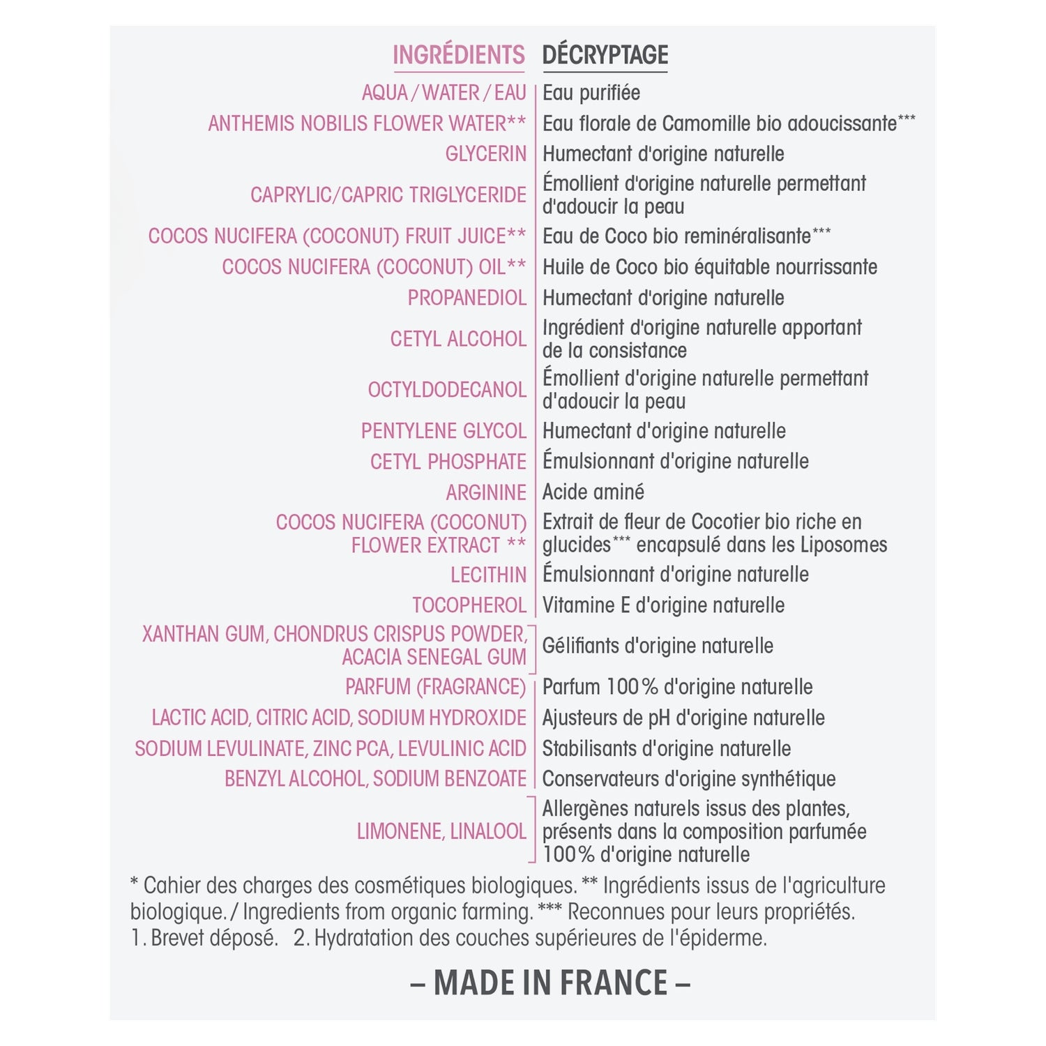 AQUA/WATER/EAU, ANTHEMIS NOBILIS BLUMENWASSER*, GLYCERIN, CAPRYLIC/CAPRIC TRIGLYCERIDE, COCOS NUCIFERA (KOKOSNUSS) FRUCHTSAFT*, COCOS NUCIFERA (KOKOSNUSS) ÖL*, PROPANEDIOL, CETYLALKOHOL, OCTYLDODECANOL, PENTYLENGLYKOL, CETYLPHOSPHAT, ARGININ, COCOS NUCIFERA (KOKOSNUSS) BLUMENEXTRAKT*, LECITHIN, TOCOPHEROL, LEVULINSÄURE, BENZYLALKOHOL, NATRIUMBENZOAT, LIMONEN, LINALOOL *Inhaltsstoffe aus biologischem Anbau. **Anerkannt für ihre Eigenschaften.