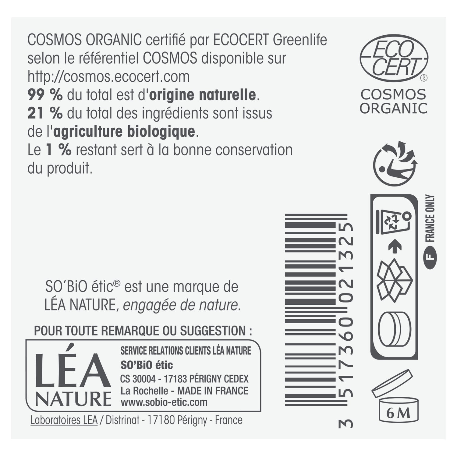 COSMOS ORGANIC zertifiziert durch ECOCERT Greenlife gemäß dem COSMOS-Standard, verfügbar unter http://cosmos.ecocert.com. 99 % der Gesamtmenge sind natürlichen Ursprungs. 21 % der gesamten Inhaltsstoffe stammen aus biologischem Anbau. Das restliche 1 % wird für die ordnungsgemäße Konservierung des Produkts verwendet. 0 % Silikon und synthetische Duftstoffe. DERMATOLOGISCH GETESTET. Hergestellt in Frankreich.