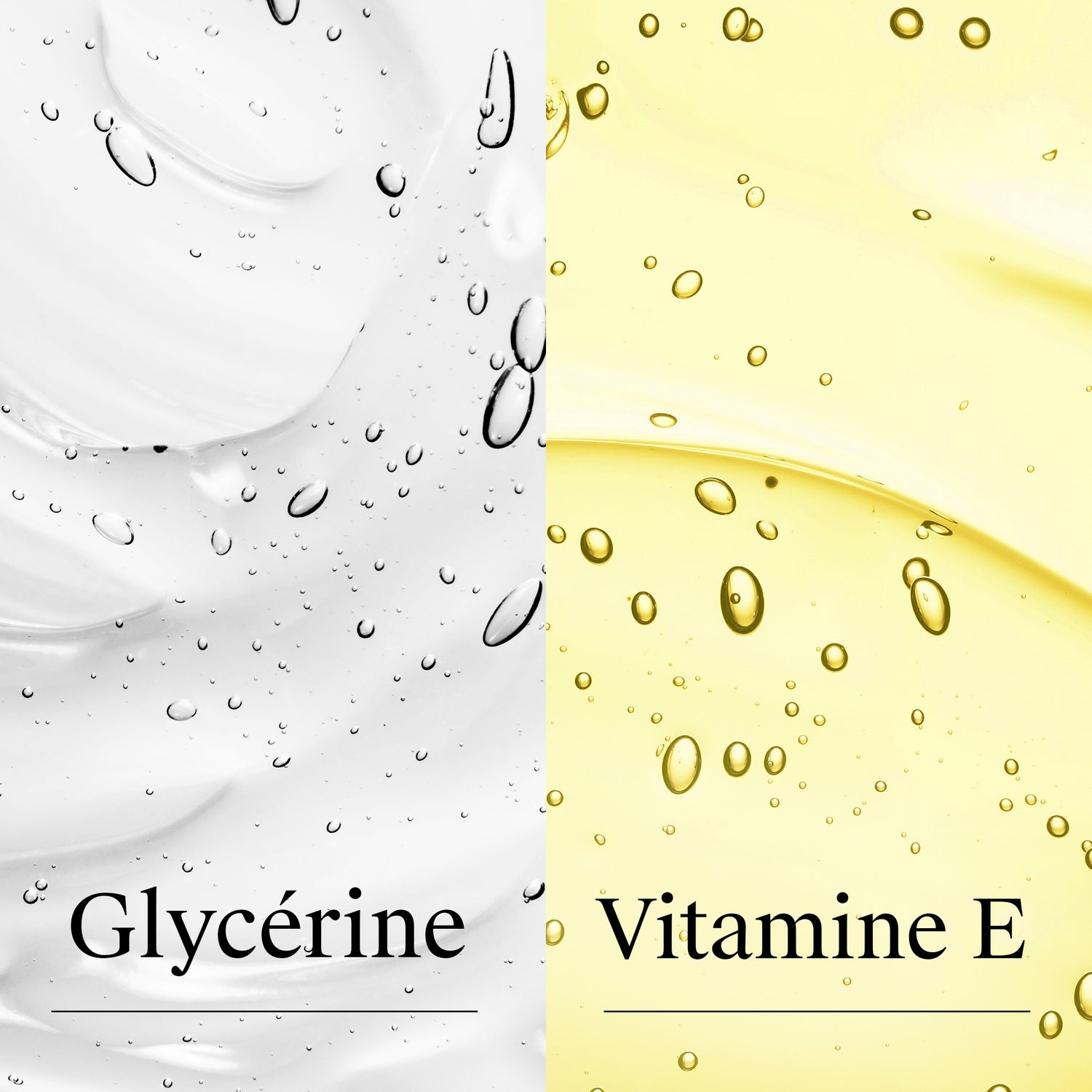 Aqua, Glycerin, Paraffinum Liquidum, Isopropylpalmitat, Petrolatum, Dimethicon, Stearylalkohol, Glycerylstearat, PEG-100-Stearat, Panthenol, Ethylhexylglycerin, Palmitinsäure, Stearinsäure, Ammoniumacryloyldimethyltaurat/VP-Copolymer, Acrylate/C10-30-Alkylacrylat-Crosspolymer, Dinatrium-EDTA, Natriumhydroxid, Tocopherylacetat, Phenoxyethanol, Parfum.