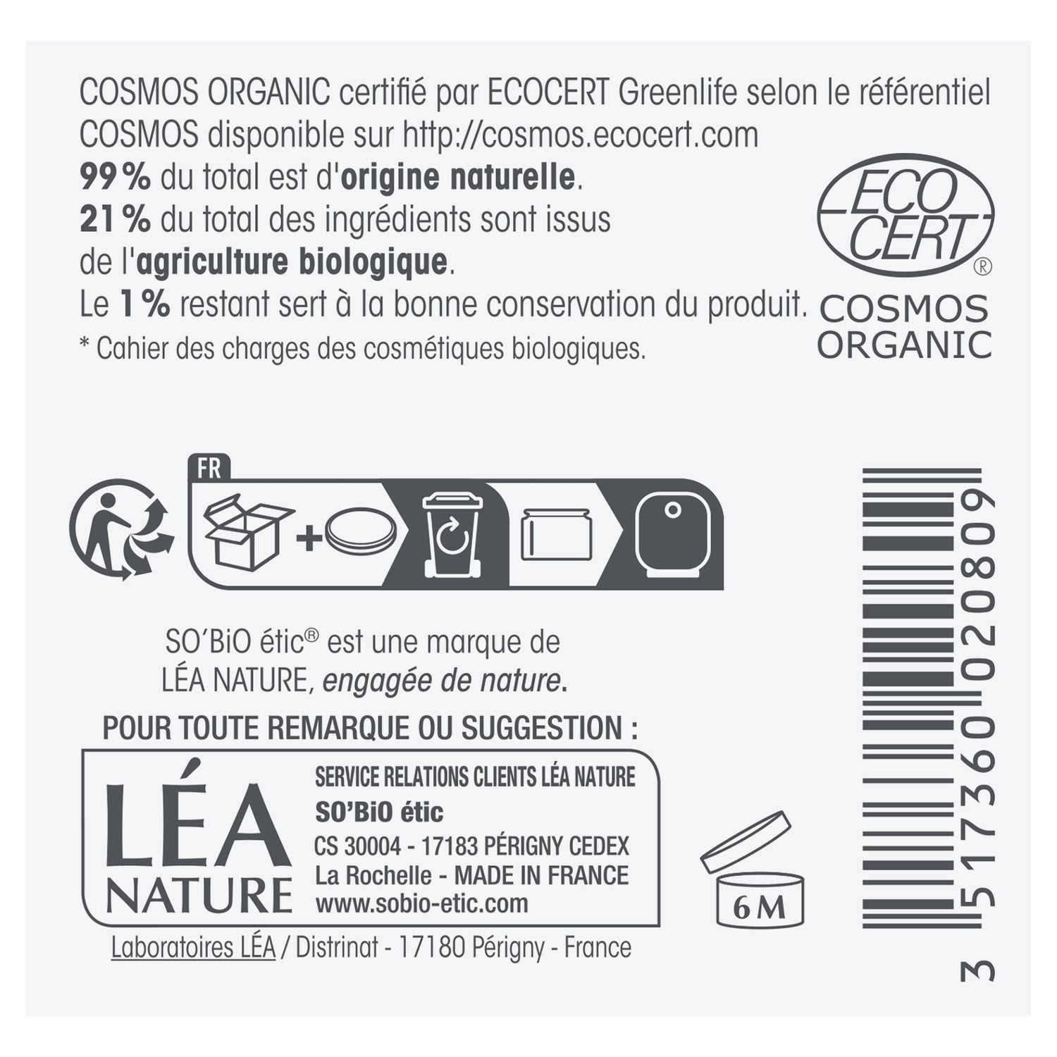 COSMOS ORGANIC zertifiziert durch ECOCERT Greenlife gemäß dem COSMOS-Standard, verfügbar unter http://cosmos.ecocert.com. 99 % der Gesamtmenge sind natürlichen Ursprungs. 21 % der gesamten Inhaltsstoffe stammen aus biologischem Anbau. Das restliche 1 % wird für die ordnungsgemäße Konservierung des Produkts verwendet. DERMATOLOGISCH GETESTET. 0 % SILIKON, MINERALÖL & SYNTHETISCHES PARFÜM. HERGESTELLT IN FRANKREICH