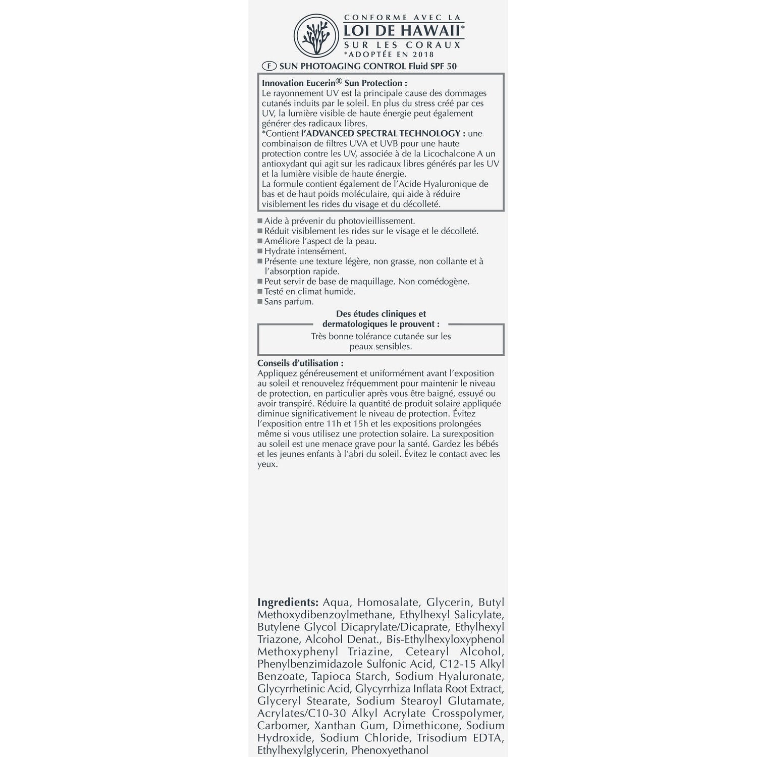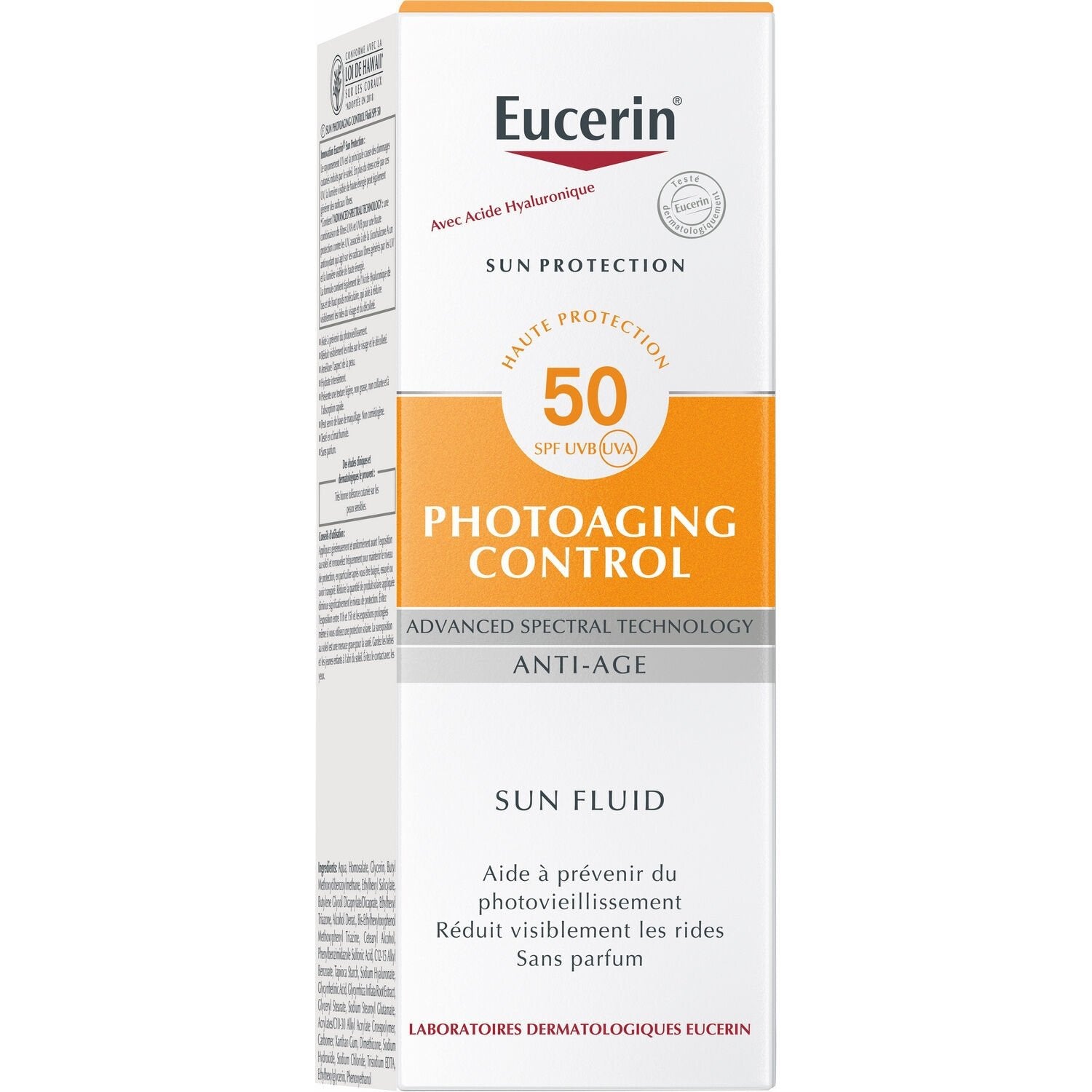 Eucerin SUN PHOTOAGING CONTROL Fluid SPF 50 mit seiner innovativen Formel schützt die Haut dank eines UVA/UVB-Filtersystems vor Sonnenschäden. Seine Zusammensetzung aus Licochalcon A und Hyaluronsäure hilft, die Haut zu schützen und der Hautalterung entgegenzuwirken.