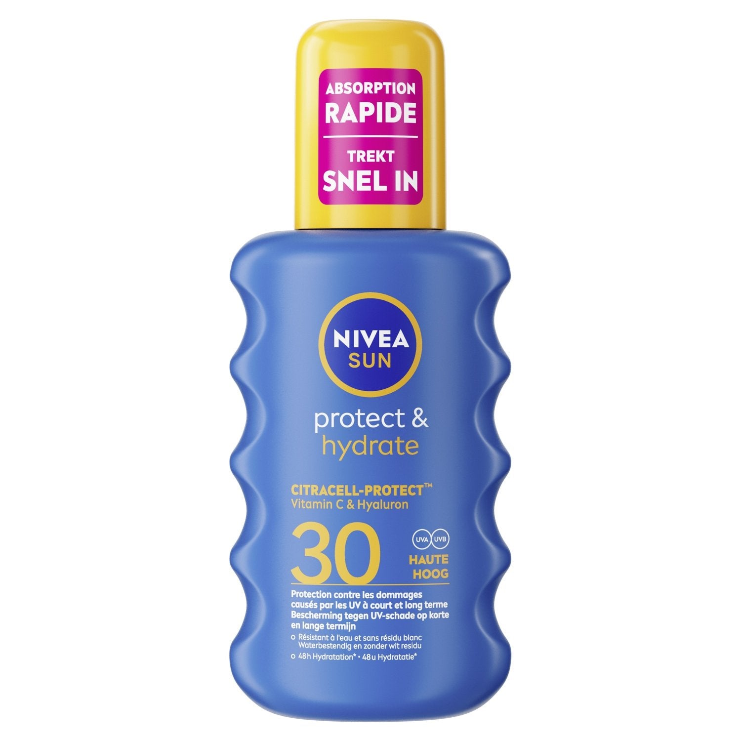 NIVEA SUN Protect & Hydrate SPF 30 Sonnenschutzspray 200 ml schützt die Haut von innen und außen mit SEHR HOHER SCHUTZwirkung vor UVA-/UVB-Strahlen. Seine fortschrittliche Formel bietet sofortigen Schutz vor UVA-/UVB-Strahlen. Es schützt sofort vor Sonnenbrand und vorzeitiger Hautalterung und spendet dank der Kombination aus HYALURONSÄURE und VITAMIN C 48 Stunden lang Feuchtigkeit. Seine leichte, nicht fettende Textur zieht schnell ein und ist wasserfest für optimalen Tragekomfort. Hautverträglichkeit dermatologisch getestet.