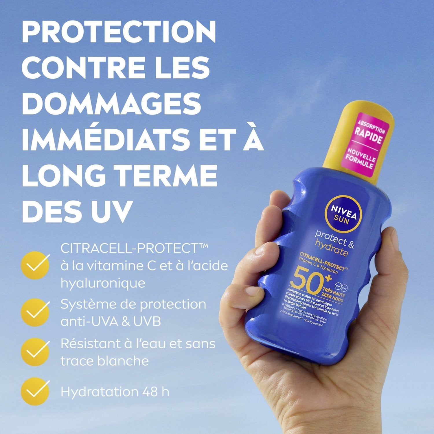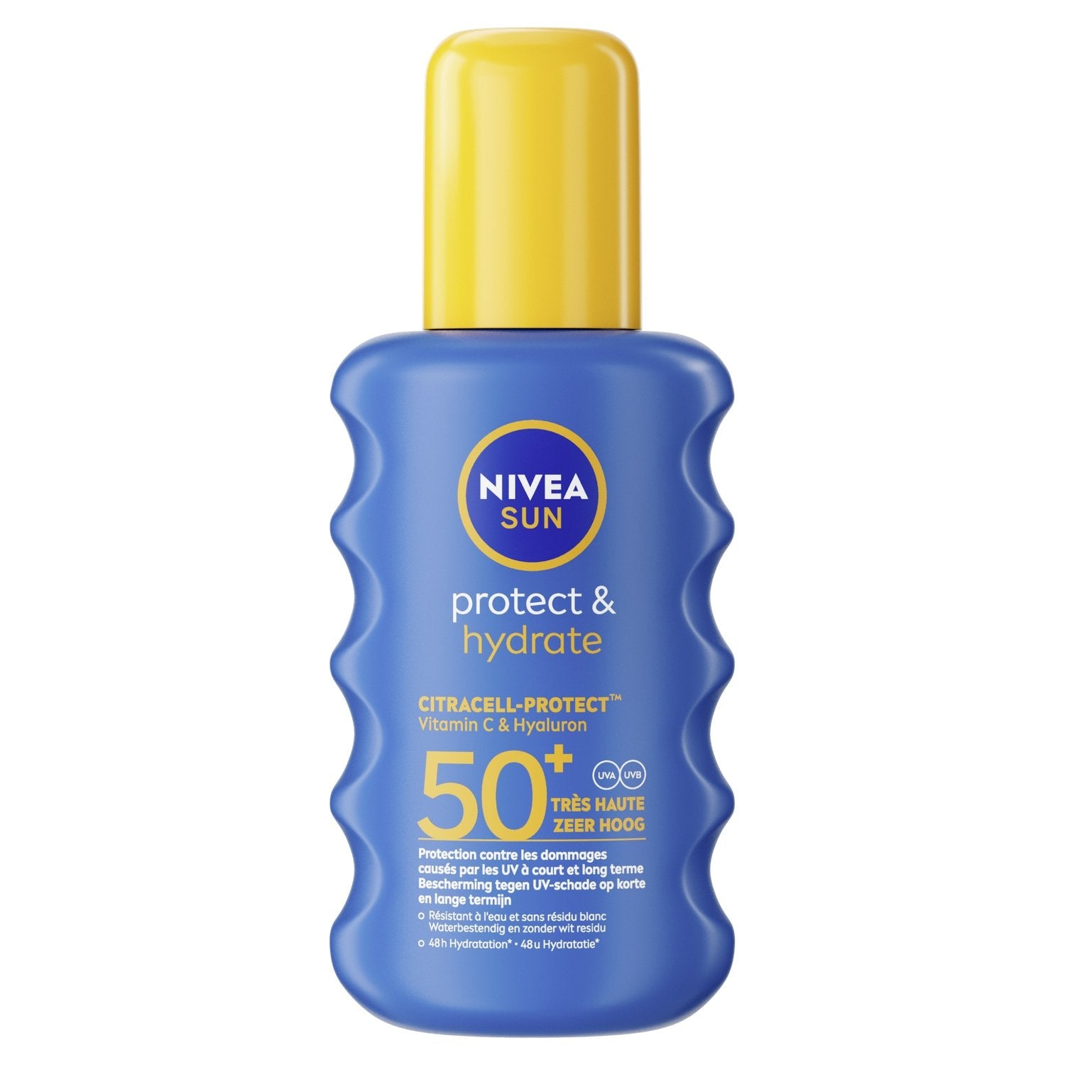 NIVEA SUN Protect & Hydrate SPF50+ Sonnenschutzspray schützt die Haut von innen und außen und bietet SEHR HOHEN SCHUTZ vor UVA-/UVB-Strahlen. Seine fortschrittliche Formel bietet sofortigen Schutz vor UVA-/UVB-Strahlen. Es schützt sofort vor Sonnenbrand und vorzeitiger Hautalterung und spendet dank der Kombination aus HYALURONSÄURE und VITAMIN C 48 Stunden lang Feuchtigkeit. Seine leichte, nicht fettende Textur zieht schnell ein und ist wasserfest für optimalen Tragekomfort. Hautverträglichkeit unter dermatologischer Kontrolle getestet.