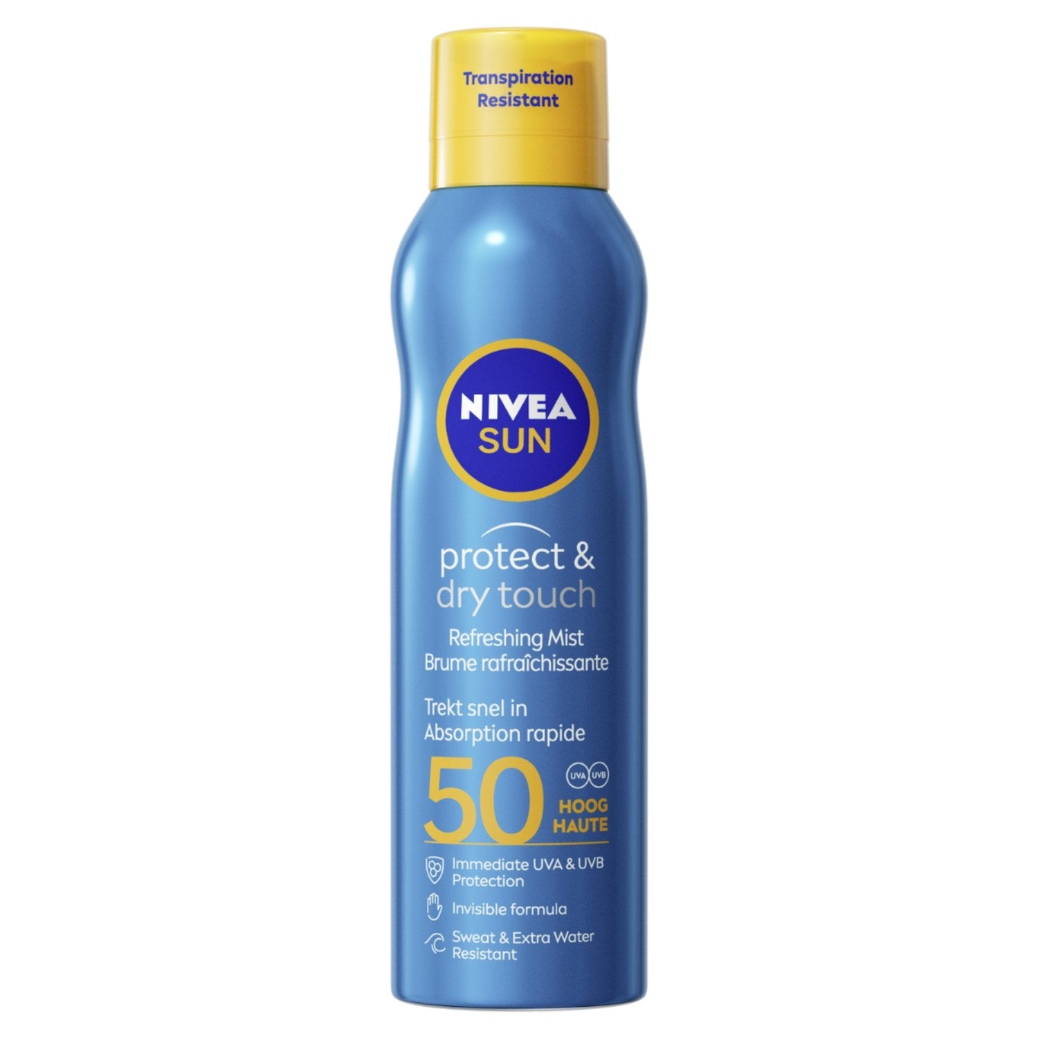NIVEA SUN Protect & Dry Touch Erfrischendes Spray bietet sofort hochwirksamen und zuverlässigen UVA/UVB-Schutz und hat gleichzeitig einen angenehm kühlenden Effekt auf der Haut. Die leichte, nicht fettende Formel ist hoch schweiß- und wasserabweisend und auf jedem Hautton unsichtbar. Zudem zieht das Spray sofort in die Haut ein und lässt sich aus jedem Winkel aufsprühen, was eine besonders einfache Anwendung ohne wiederholtes Pumpen ermöglicht. Das Produkt ist für den Sport geeignet. Hautverträglichkeit dermatologisch bestätigt. Vermeiden Sie Sonneneinstrahlung zwischen 12 und 16 Uhr sowie längere Sonneneinstrahlung, auch wenn Sie Sonnenschutzmittel verwenden; übermäßige Sonneneinstrahlung ist gesundheitsschädlich.