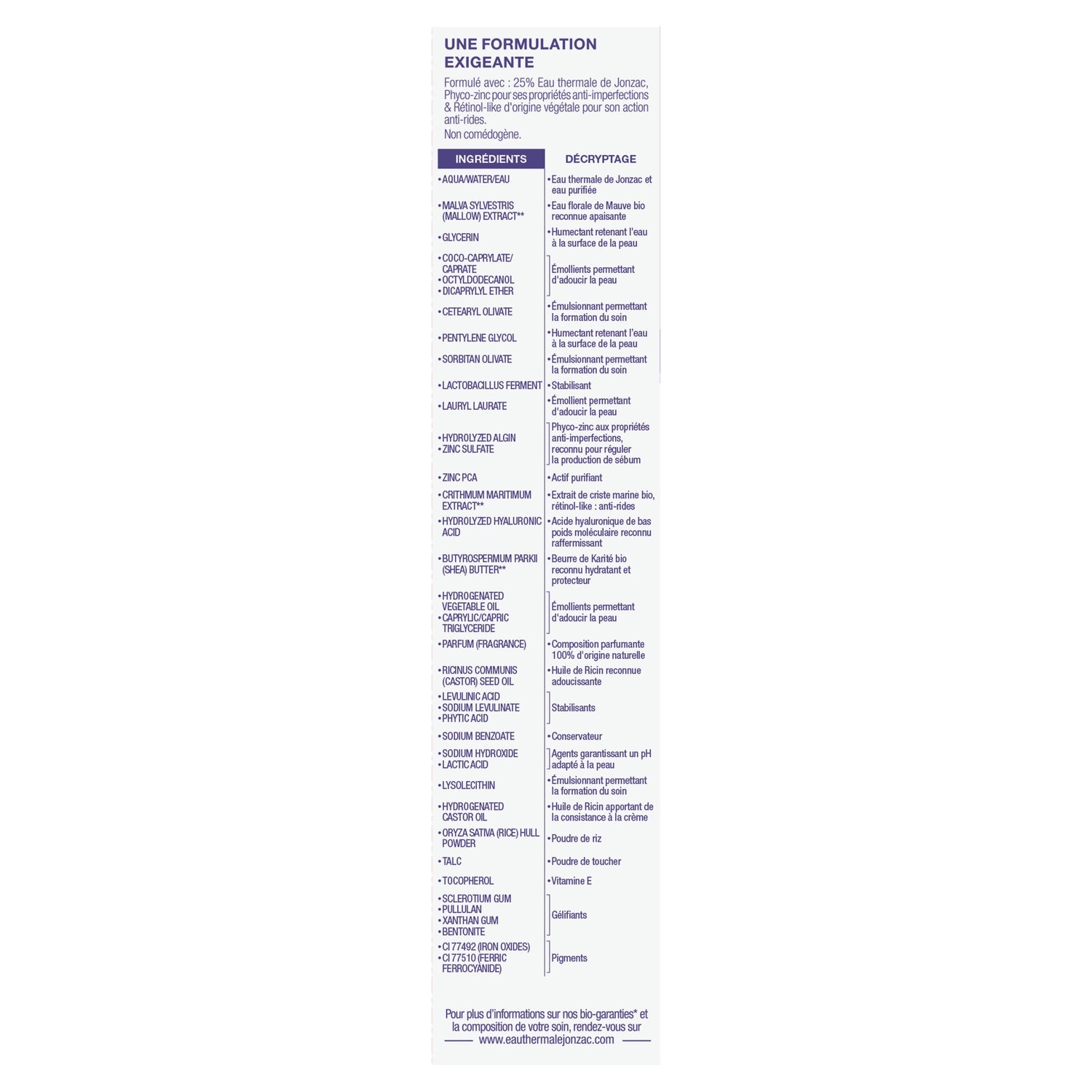 Formuliert mit: 25 % Jonzac-Thermalwasser, Phyto-Zink-PCA für seine Anti-Hautunreinheiten-Eigenschaften und pflanzlichem Retinol, bekannt für seine Anti-Falten-Wirkung. Nicht komedogen. Hohe Verträglichkeit. Hergestellt in Frankreich. Vegan. Block-Garantien (0 % Alkohol, Silikon, Mineralöl).