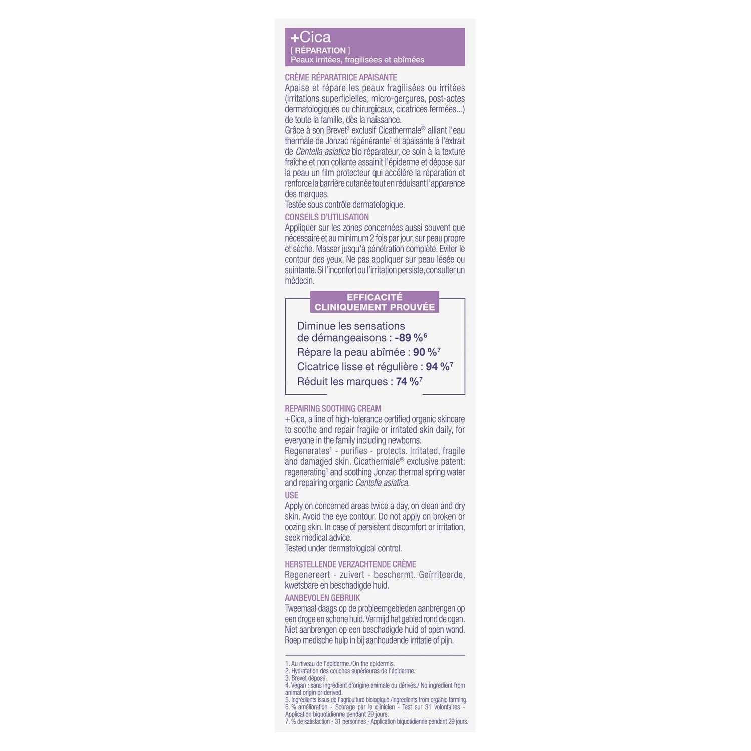 Die +CICA Reparaturcreme beruhigt und repariert geschwächte oder gereizte Haut (oberflächliche Reizungen, Mikrorisse, nach dermatologischen oder chirurgischen Eingriffen, geschlossene Narben usw.) für die ganze Familie, von Geburt an. Dank des exklusiven Cicathermale®-Patents3, das regenerierendes1 und beruhigendes Jonzac-Thermalwasser mit regenerierendem Bio-Centella-Asiatica-Extrakt kombiniert, reinigt diese Behandlung mit einer frischen, nicht klebrigen Textur die Epidermis und hinterlässt einen Schutzfilm auf der Haut, der die Reparatur beschleunigt und die Hautbarriere stärkt, während gleichzeitig das Auftreten von Flecken reduziert wird. Reduziert Juckreiz: -89 %6 Repariert geschädigte Haut: 90 %7 Glatte und regelmäßige Narben: 94 %7 Reduziert Flecken: 74 %7 COSMOS Organic-zertifiziert 99 % natürlichen Ursprungs 1 % Mitglied bei „for the Planet“ Vegan Hergestellt in Frankreich