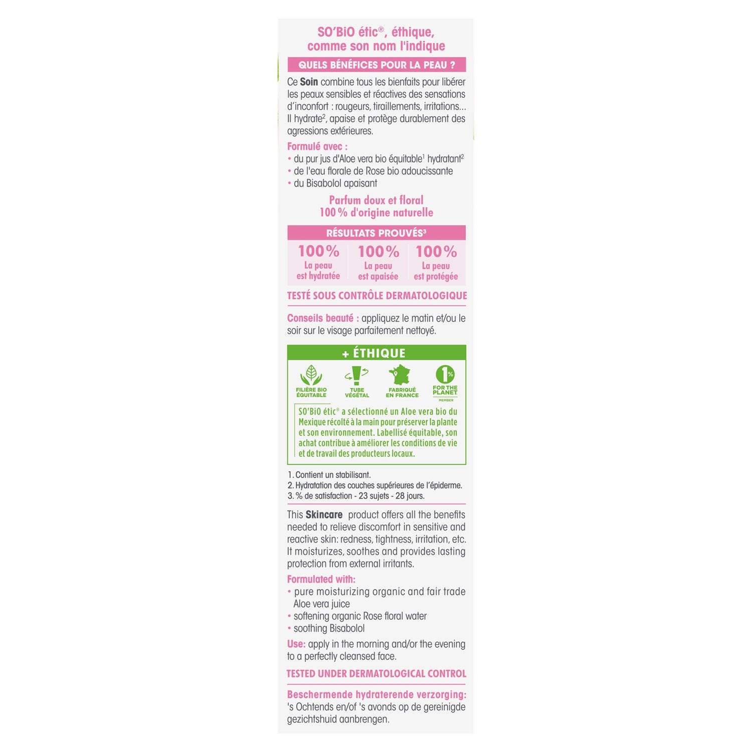 Die schützende Feuchtigkeitspflege vereint alle Vorteile, um empfindliche und reaktive Haut von unangenehmen Gefühlen zu befreien: Rötungen, Spannungsgefühle, Reizungen... Sie spendet Feuchtigkeit, beruhigt und schützt nachhaltig vor äußeren Einflüssen. Nachgewiesene Ergebnisse: - Die Haut wird mit Feuchtigkeit versorgt: 100 % - Die Haut wird beruhigt: 100 % - Die Haut wird geschützt: 100 % % Zufriedenheit. 23 Probanden – 28 Tage. COSMOS ORGANIC-zertifiziert von ECOCERT Greenlife gemäß dem COSMOS-Standard. + ETHISCH: - Fairtrade-Biosektor: SO'BiO étic hat Bio-Aloe Vera aus Mexiko ausgewählt, die von Hand geerntet wird, um die Pflanze und ihre Umwelt zu schützen. Der Kauf mit dem Fairtrade-Label trägt dazu bei, die Lebens- und Arbeitsbedingungen der lokalen Produzenten zu verbessern. - Pflanzliche Tube - Hergestellt in Frankreich - 1 % für den Planeten